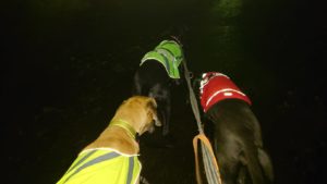 Niina oli myös hyyyyyyyyyyyyyyyyyvin uhkarohkea, ja lähti iltalenkille koko tripletin kanssa! Pennihän nyt on tietysti varma ja helppo nakki, ja Nemi nyt kävelee muuten kyllä nätisti, mutta varoittelin koiraohituksista – se voi niistä saada vähän kimmoketta… …ja sitten kun on vielä Hekla. Hekla, joka aivan varmasti saa aikaan kimmoketta, tuli vastaan sitten koira, ihminen tai pyörivä lehti. 😀 Voisi kuvitella siinä tekemistä yhdelle naiselle. 😀