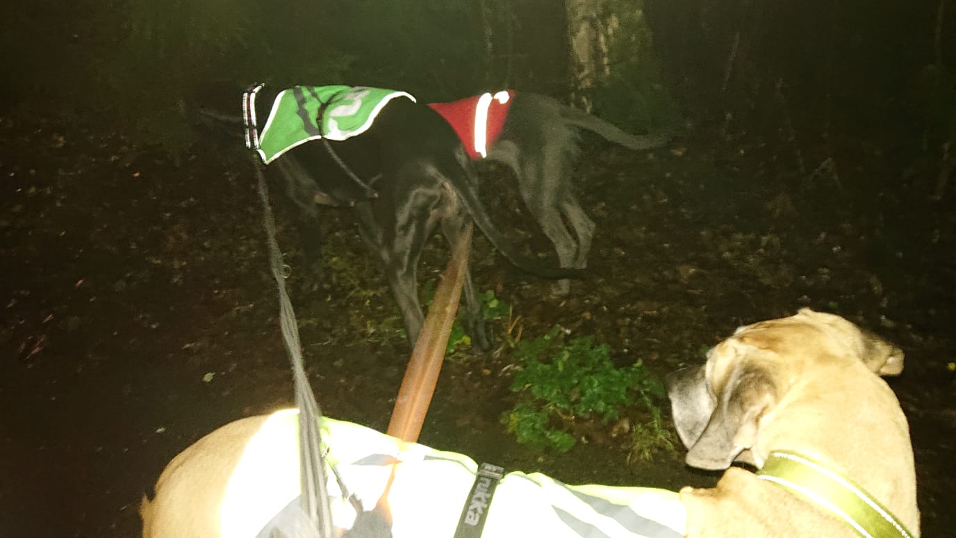 Niina oli myös hyyyyyyyyyyyyyyyyyvin uhkarohkea, ja lähti iltalenkille koko tripletin kanssa! Pennihän nyt on tietysti varma ja helppo nakki, ja Nemi nyt kävelee muuten kyllä nätisti, mutta varoittelin koiraohituksista – se voi niistä saada vähän kimmoketta… …ja sitten kun on vielä Hekla. Hekla, joka aivan varmasti saa aikaan kimmoketta, tuli vastaan sitten koira, ihminen tai pyörivä lehti. 😀 Voisi kuvitella siinä tekemistä yhdelle naiselle. 😀