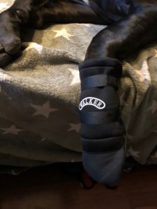 Ja sitten seuraa vinkki vitonen! Nemi nimittäin tykkäisi nuolla kaikki rasvat samantien pois, kuten varmasti suurin osa koirista. Keksinpä tässä seuraavanlaisen tavan tassujen rasvaamiseen: otan käsittelyyn yhden tassun kerrallaan. Hyvä ajankohta on illalla, kun koira on rauhallisesti sohvalla kanssamme. Rasvaan yhden tassun huolellisesti ja annan rasvan imeytyä niin kauan kuin koira vain malttaa paikallaan sohvalla maata. Sitten lopuksi asetan tassuun suojatossun – ja tossu saa olla siinä suojana koko yön! Jes! Aamulla polkuantura on mukavan pehmeä ja kimmoisa, ja halkeilemat selkeästi pehmenneitä. Seuraavana iltana käsitellään sitten seuraava tassu jne. Kannattaa kokeilla tätä tossukikkaa – eipä nimittäin ole käynyt minulla kertaakaan aiemmin mielessä, kun olen hölvännyt rasvaa kaikkiin tassuihin yhdeltä istumalta.