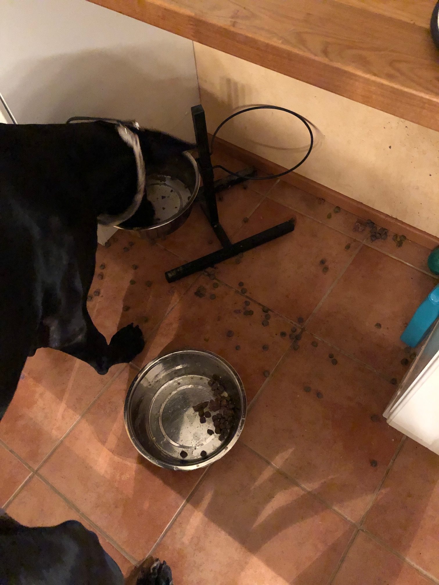 Tässä taannoin olin tarjoilemassa Nemille iltaruokaa. En tajua mitä tapahtui, mutta yhtäkkiä vaan otteeni lipesi ja 4 litran metallinen ruokakuppi täynnä nappuloita ja vettä lävähti lattialle! Onneksi kuppi putosi sellaisessa kulmassa, että vain osa nappula-vesi-sörssöstä levisi iloisesti ruokintanurkkauksen lattialle, tyhjänä olleeseen toiseen kuppiin sekä seinille. Katsoin sotkua hetken, huokaisin ja totesin koiralle: Ole hyvä. Sai se Nemi syötyä ruokansa lattialtakin, mutta.. joo, kaikenlaista sitä sattuu 😀