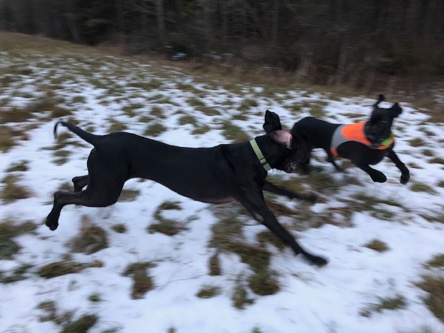 Leikkihetket koirakavereiden kanssa sujuu aina hyvässä, toimeliaissa ja vauhdikkaissa merkeissä – eikä siinä mitään, niinhän pitääkin mennä! Sitä vartenhan koirakavereita käydään tervehtimässä, jotta pääsee purkamaan energioita, leikkimään, juoksemaan, vähän riehumaankin ja puhumaan koiraa – olemaan KOIRA toisen samanmoisen kanssa. En vaan tiedä, mikä ihme siinä on, että jos joku ottaa hittiä, se on aina Nemi. Nyt viime aikoina ei ole onneksi tapahtunut mitään vakavampaa (*koputtaa puuta*), mutta tuntuu että joka kerta Nemi tulee kotiin lenkiltä parin ylimääräisen arven kera ja minä jään jännittelemään, meinaavatko jäljet tällä kertaa kasvaa vielä peittoon. Danny on onnistunut nappaamaan leikin tuoksinnassa Nemiä pari kertaa kylkinahoista ja silmän vierestä niin, että rupien kuivuttua ja irrottua oikeasti pelkäsin jäljelle jääneiden valkoisten jälkien jäävän pysyväisiksi. Mutta ei se ole ainoastaan Danny; tällä hetkellä kasvatellaan kulmahampaan osumaa umpeen kuonosta, jonka sai aikaan Hekla edellistapaamisellamme 😀 …En tiedä, onko Nemi jotenkin normaalia tapaturma-alttiimpi yksilö, vai onko se vain tuo musta väri, josta nämä kaikki pienetkin vekit ja jäljet paistavat kilometrin päähän 🙂 Onneksi tähän mennessä kaikki jäljet näyttävät vielä peittyvän mustan, kiiltävän uudiskarvan peittoon!