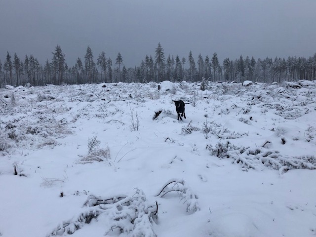 Lumi (ja musta koira) piirtävät kauniita siluetteja maisemaan