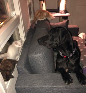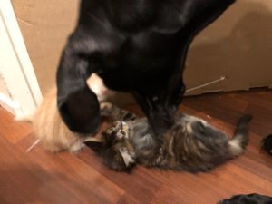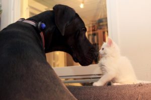 Jätti-ison koiran nenä tutkii ja nuuskuttaa koko kissanpennun läpikotaisin. Nenä on suhteessa pennun kokoon aivan tolkuttoman suuri. Kahdeksan viikon ikäinen kissanpentu vain kääntyy selälleen, alkaa potkia jänispotkuja, ja pian se taas taas kiepsahtaa ympäri ja sujahtaa jo eri suuntaan häntä soirossa. Koira jää paikoilleen katsomaan. Leikkihetki kesti ehkä vain sekunnin, mutta kummastakin se oli hauskaa.