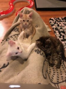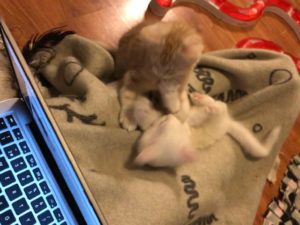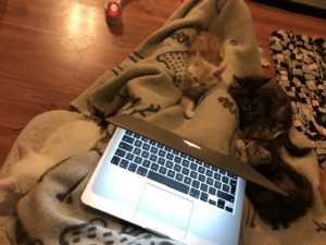 Neljällä yhdeksänviikkoisella pennulla riitti puuhaa blogin päivittämisessä. Välillä pennut seurasivat tarkkaan rapisevaa näppäimistöä ja täppäilivät sormiani molemmin puolin läppäriä, välillä jouduin korjaamaan tekstejä kissanpentujen kirjoituksia poistaessani. Lopulta kaikki neljä nukahtivat kanssani viltille.