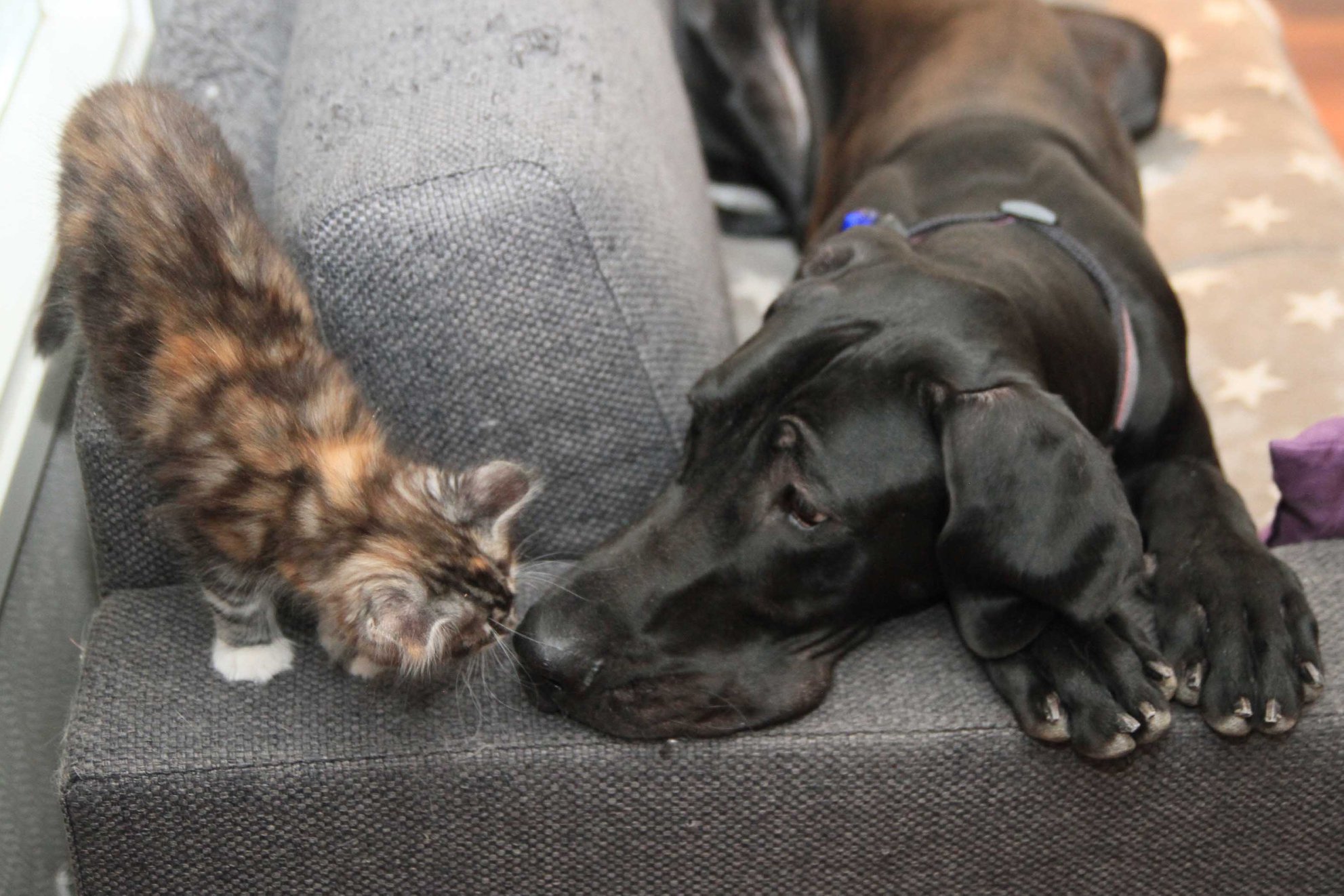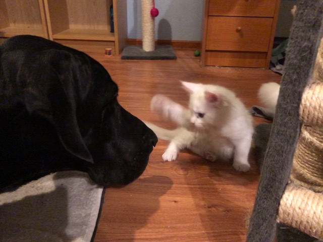 Jätti-ison koiran nenä tutkii ja nuuskuttaa koko kissanpennun läpikotaisin. Nenä on suhteessa pennun kokoon aivan tolkuttoman suuri. Kahdeksan viikon ikäinen kissanpentu vain kääntyy selälleen, alkaa potkia jänispotkuja, ja pian se taas taas kiepsahtaa ympäri ja sujahtaa jo eri suuntaan häntä soirossa. Koira jää paikoilleen katsomaan. Leikkihetki kesti ehkä vain sekunnin, mutta kummastakin se oli hauskaa.
