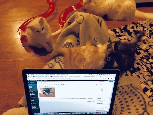 Neljällä yhdeksänviikkoisella pennulla riitti puuhaa blogin päivittämisessä. Välillä pennut seurasivat tarkkaan rapisevaa näppäimistöä ja täppäilivät sormiani molemmin puolin läppäriä, välillä jouduin korjaamaan tekstejä kissanpentujen kirjoituksia poistaessani. Lopulta kaikki neljä nukahtivat kanssani viltille.