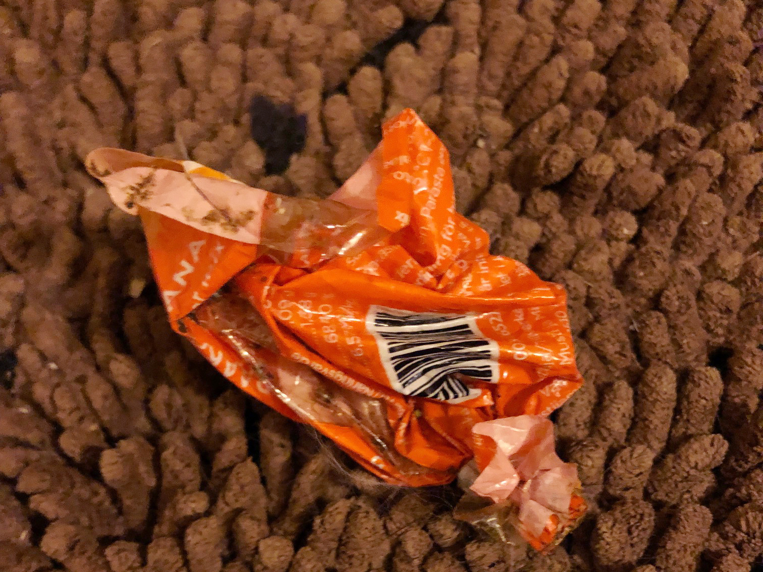 Tästä ei mennyt kuin ihan muutama päivä eteenpäin, kun töissä, sopivasti oman ruokapaussini aikana, katselin Nemin käyttäytymistä. Se oli jotenkin huonovointisen oloinen. Olin nousemassa ylös ja suunnittelin vieväni koiran ulos, mutta Nemi ehti ensin: täydeksi yllätyksekseni lattialle lävähti kasa aamupalaa, sekä ihan toisen värisen lihapötkön kuori – tällä kertaa turkoosi pätkä muovia! Tähän en keksi mitään muuta selitystä kuin että Nemi on käynyt ratsaamassa roskapussia minun tietämättäni. Tuhma!