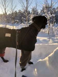 Nemin varustukseen kuului tänään pitkäpunttinen Hurtta-fleecehaalari sekä Back On Trackin talviloimi. Tällä varustuksella Nemiä ei paleltanut!
