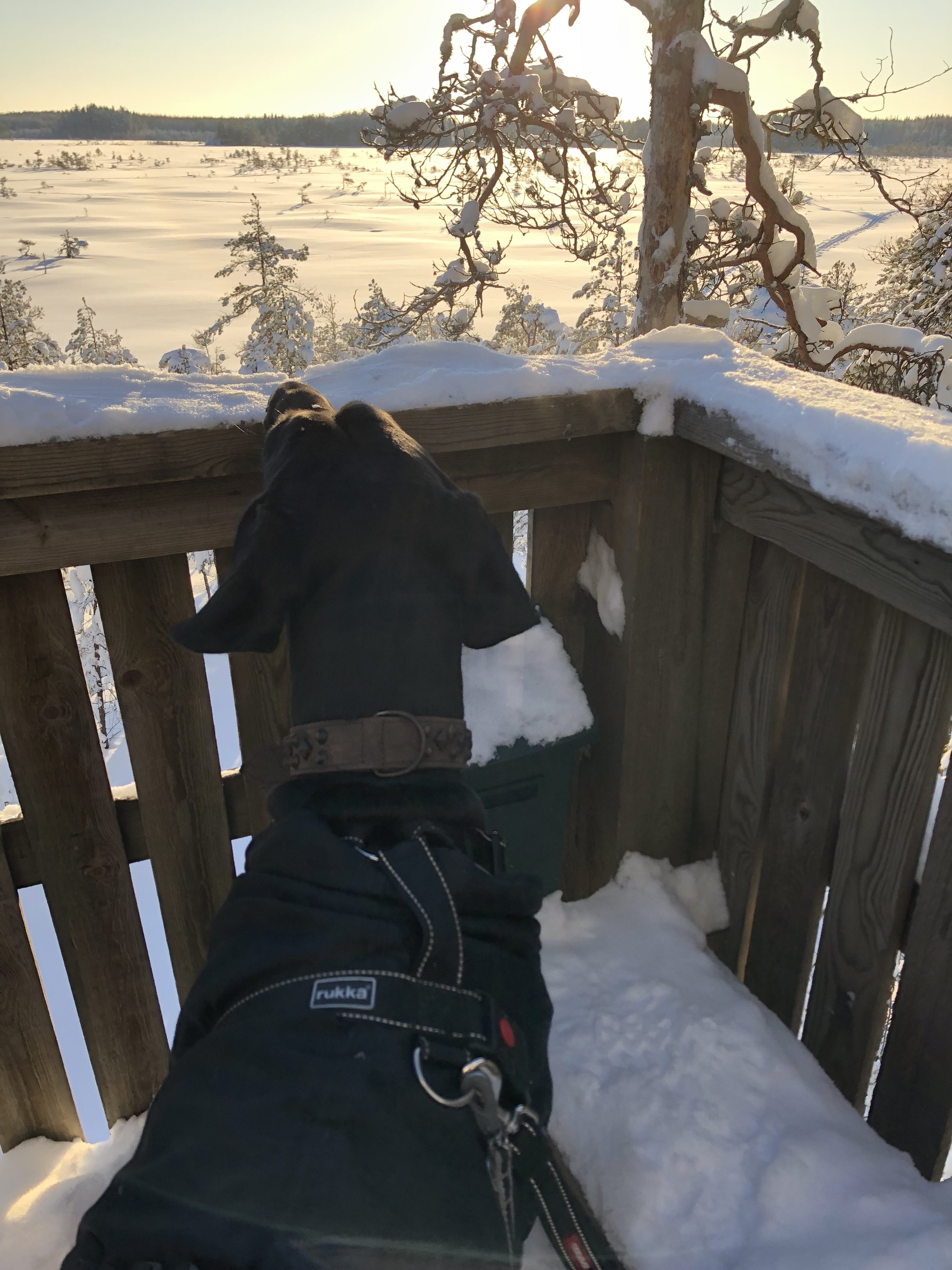 Noh, joka tapauksessa. Polku mutkitteli upean lumisella ja aurinkoisella suoalueella ja kulki pian näköalatornille. Minä totesin, että Nemi saa tulla lintutorniin maisemoitsemaan kanssamme – tekee tytölle ihan hyvää harjoitella tällaisia porraskapuamisia. Portaissa oli pieni, pakkaantunut lumikerros ja avonaiset porrasvälit, josta näki läpi, joten eipä mikään ihme että ensikertalainen meinasi pistää vähän hanttiin. Muutaman kerran Nemi nousi portaille, muttei uskaltanut lähteä etenemään ylöspäin. Uusi lähtöyritys maan tasalta muutamaan otteeseen, ja niin sitä taas saatiin voitettua pienen koiranpennun pelkoja ja ennakkoluuloja!! 😀 Pelkäsin alastulon olevan vaikeampi paikka, mutta se itse asiassa meni paljon nopeammin ja helpommin kuin ylös kapuaminen.