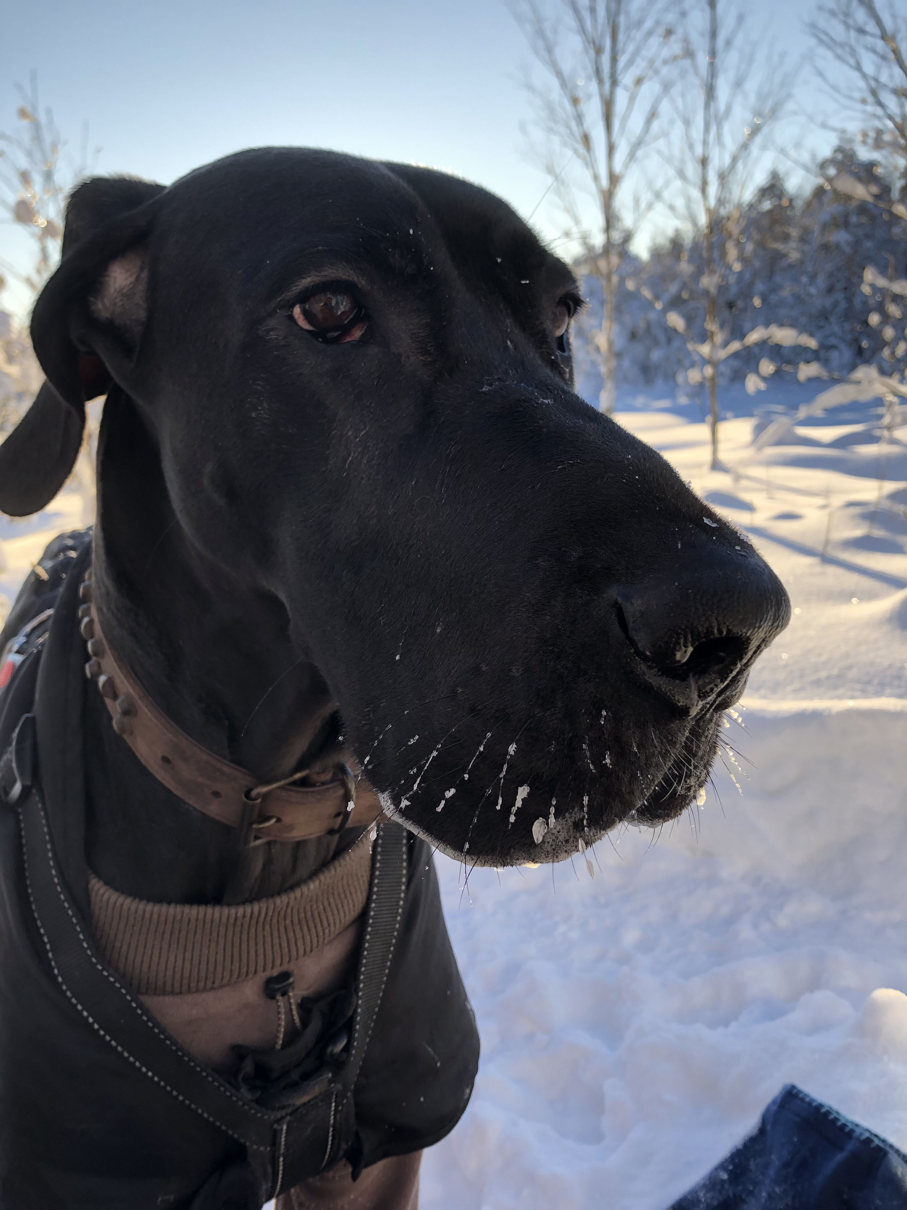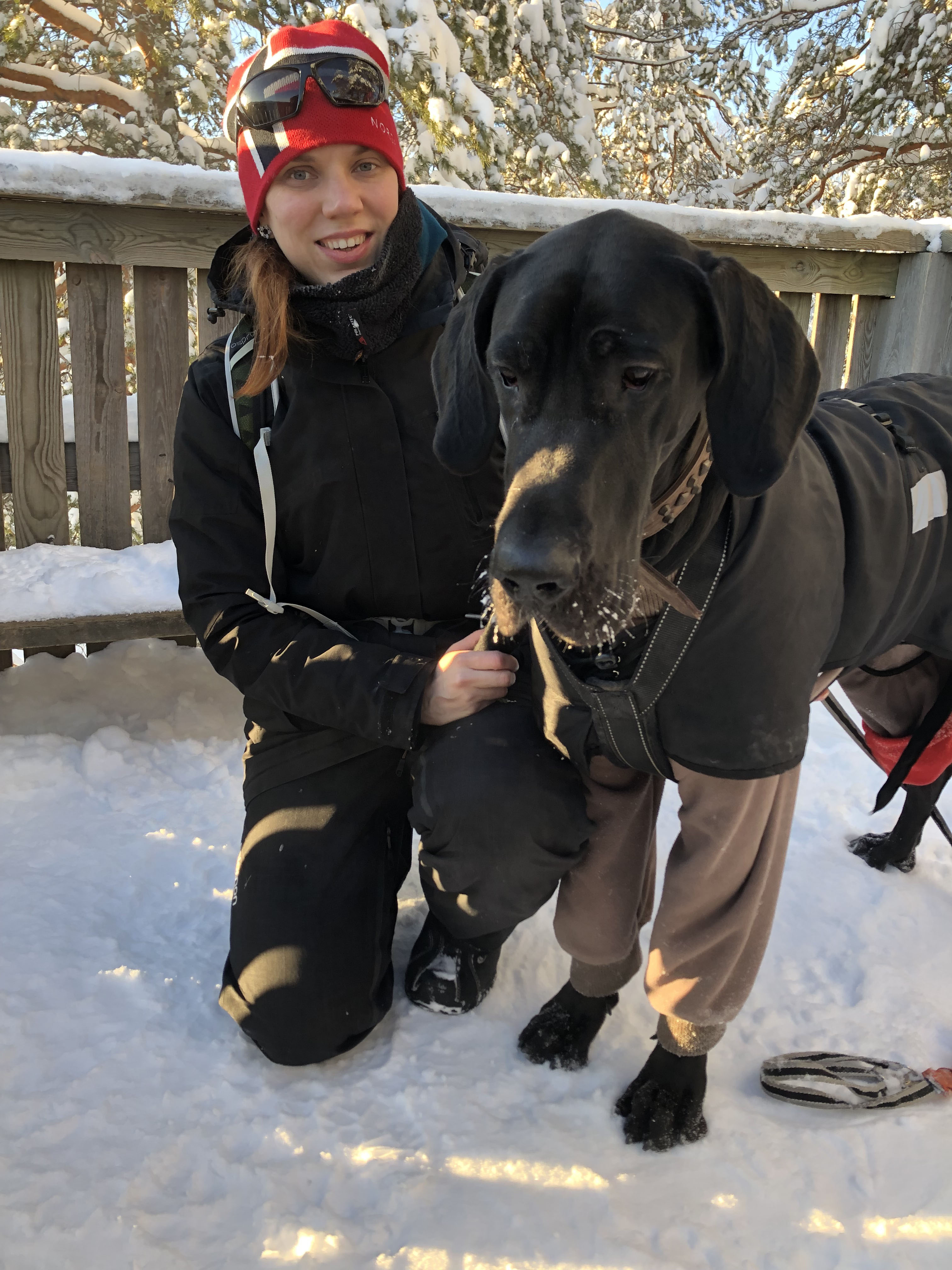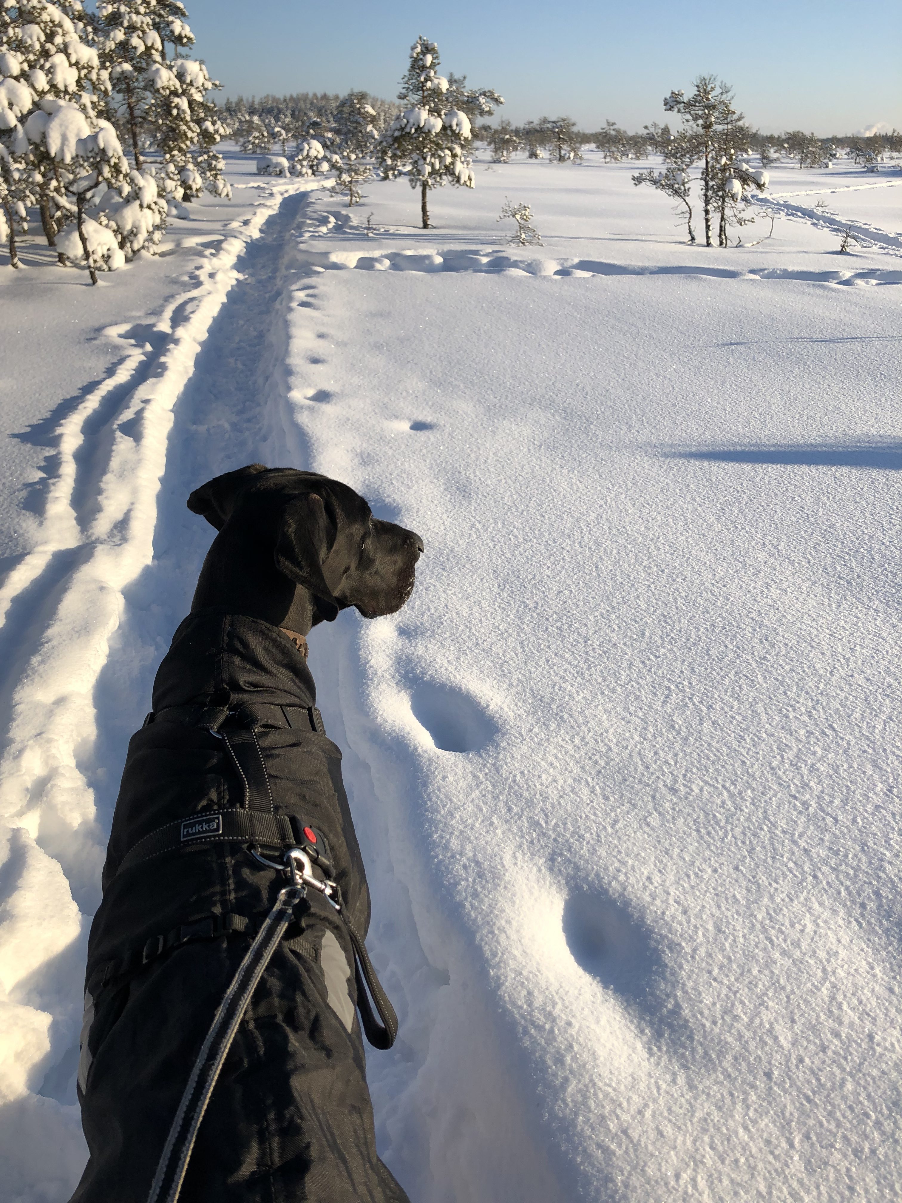 Nemin varustukseen kuului tänään pitkäpunttinen Hurtta-fleecehaalari sekä Back On Trackin talviloimi. Tällä varustuksella Nemiä ei paleltanut!