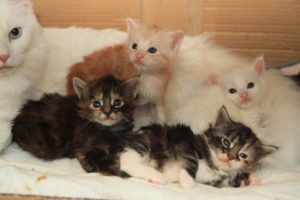 Vasemmalta: poika Vuorensinen Ironweed (punahopeatabby), tyttö Vuorensinen Iris (kilpikonnatabby); toinen rivi poika Vuorensinen Inkberry (valkoinen oranssisilmäinen) ja Vuorensinen Ivy (kilpikonnatabby valkoisella). Ikää kuvissa 13 viikkoa.