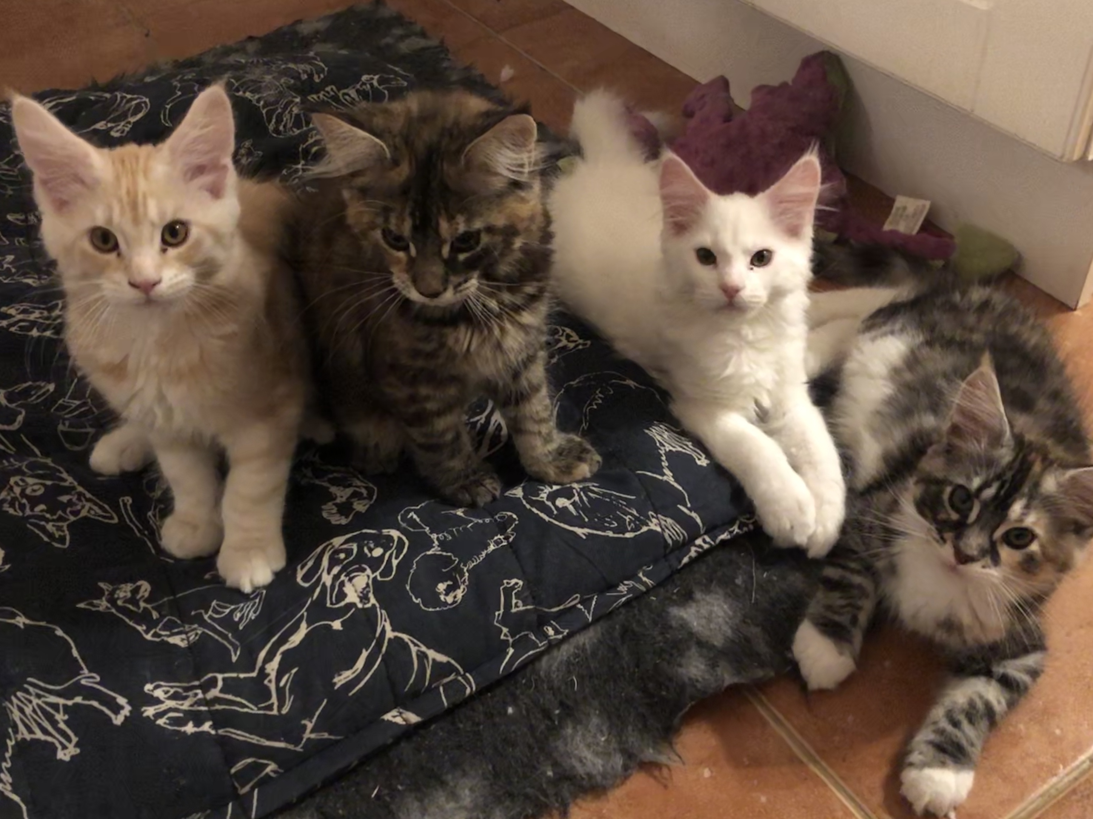 Vasemmalta: poika Vuorensinen Ironweed (punahopeatabby), tyttö Vuorensinen Iris (kilpikonnatabby); toinen rivi poika Vuorensinen Inkberry (valkoinen oranssisilmäinen) ja Vuorensinen Ivy (kilpikonnatabby valkoisella). Ikää kuvissa 13 viikkoa.