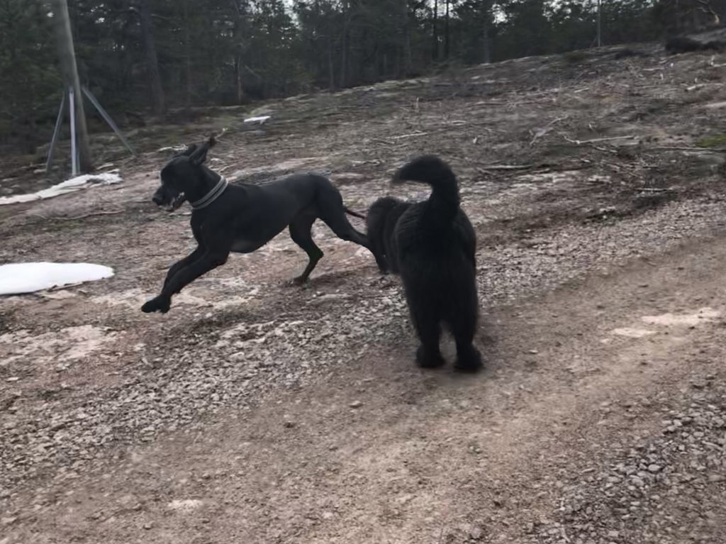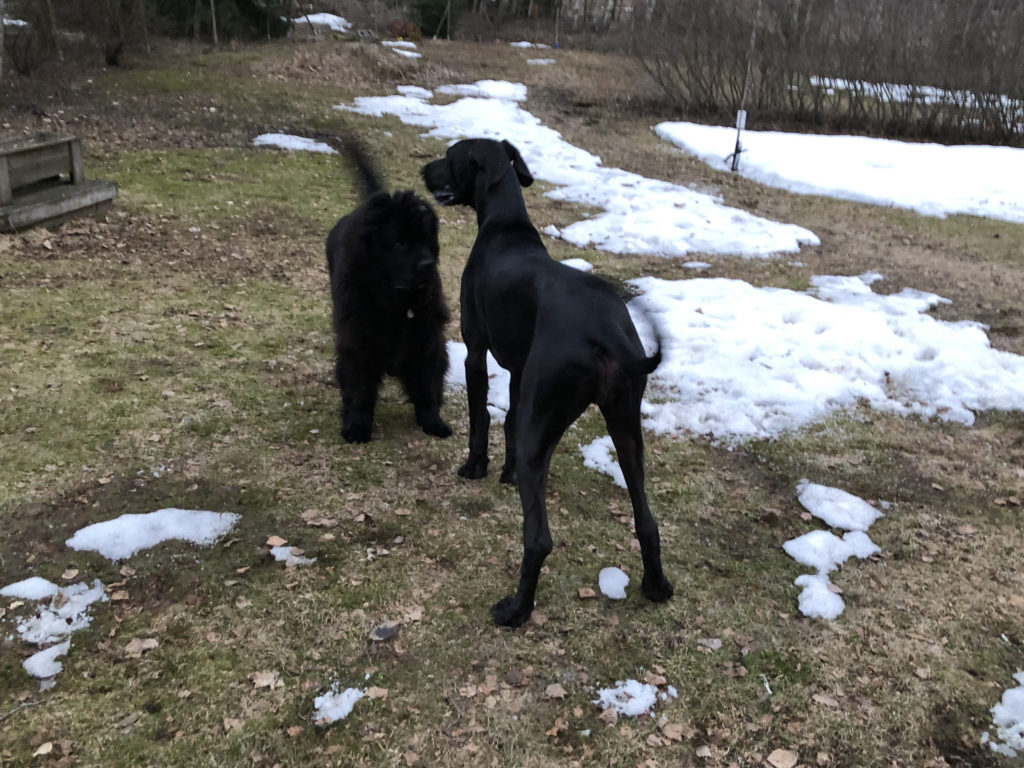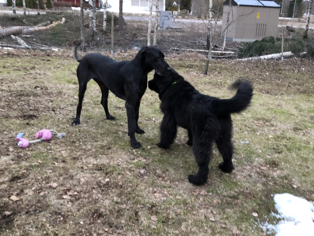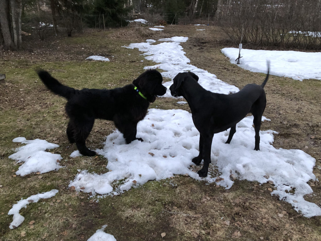 Nemi ja Waldo tapasivat aidatulla pihallamme, ja tulivat juttuun ihan ensi nuuhkaisulta. Nemi lähti pinkomaan pihalla miljoonaa (“Jee! Juoksukaveri!”) ja saattoi hieman hämmästyä, kun kaveri ei ihan pysynyt vauhdissa perässä. 😀
