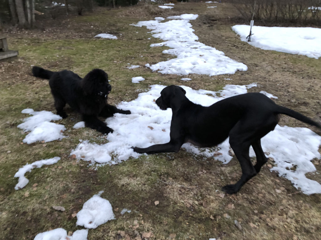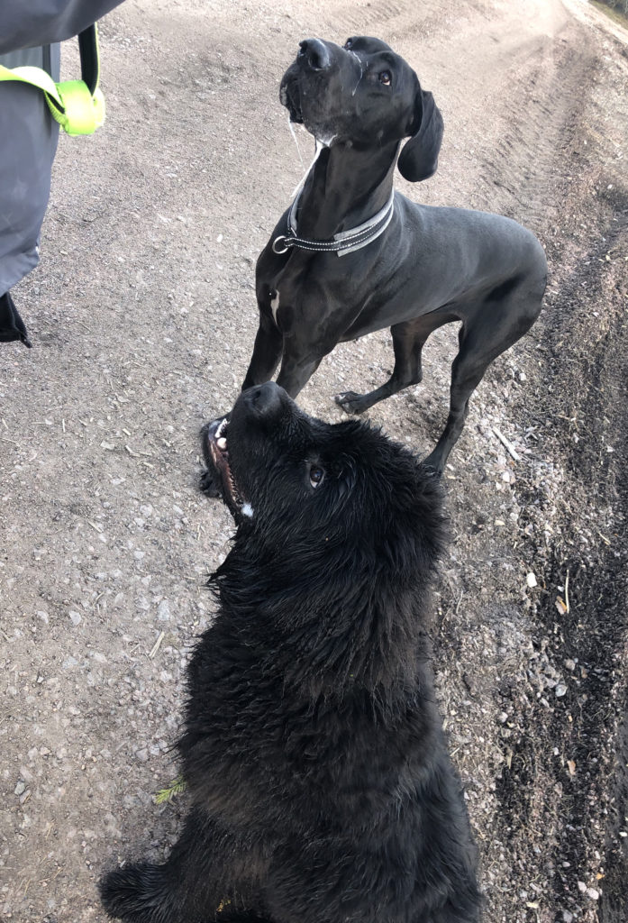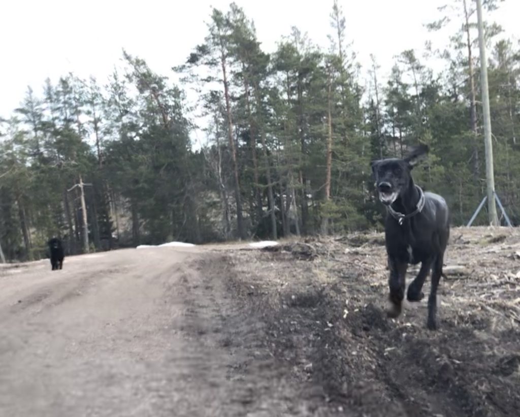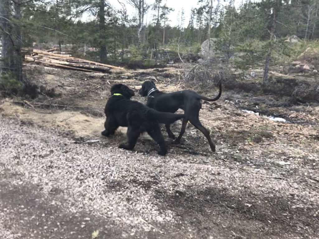 Nemi ja Waldo tapasivat aidatulla pihallamme, ja tulivat juttuun ihan ensi nuuhkaisulta. Nemi lähti pinkomaan pihalla miljoonaa (“Jee! Juoksukaveri!”) ja saattoi hieman hämmästyä, kun kaveri ei ihan pysynyt vauhdissa perässä. 😀