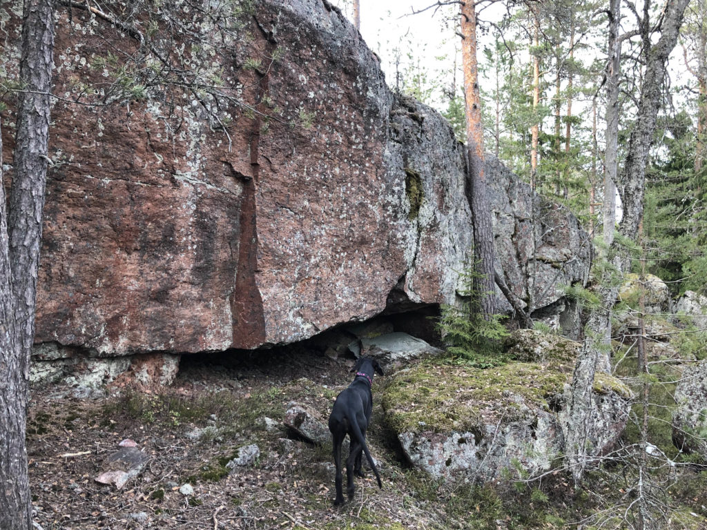 Ensin polulta oli havaittavissa kallion seinä, ja lähemmäs päästyämme näimme sen alapuolelle muodostuneen, jo ihan sateensuojaksi käyvän, luolamaisen syvennyksen.