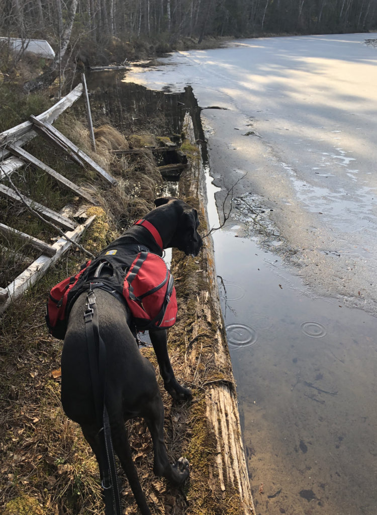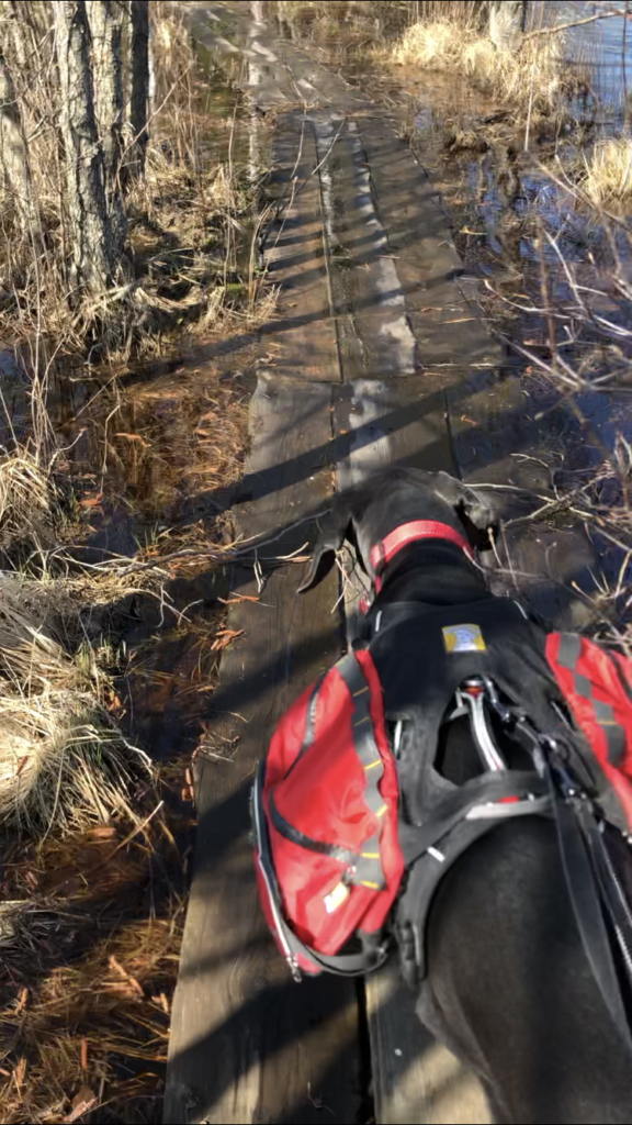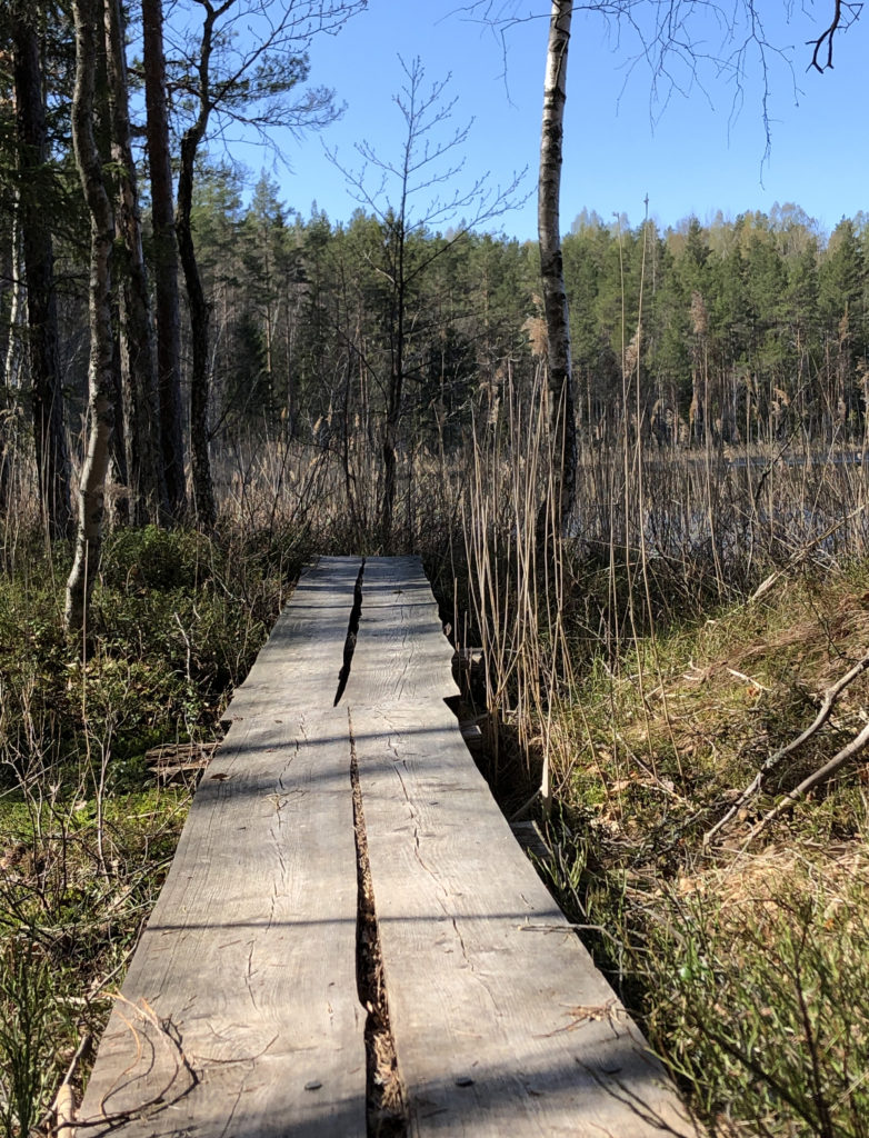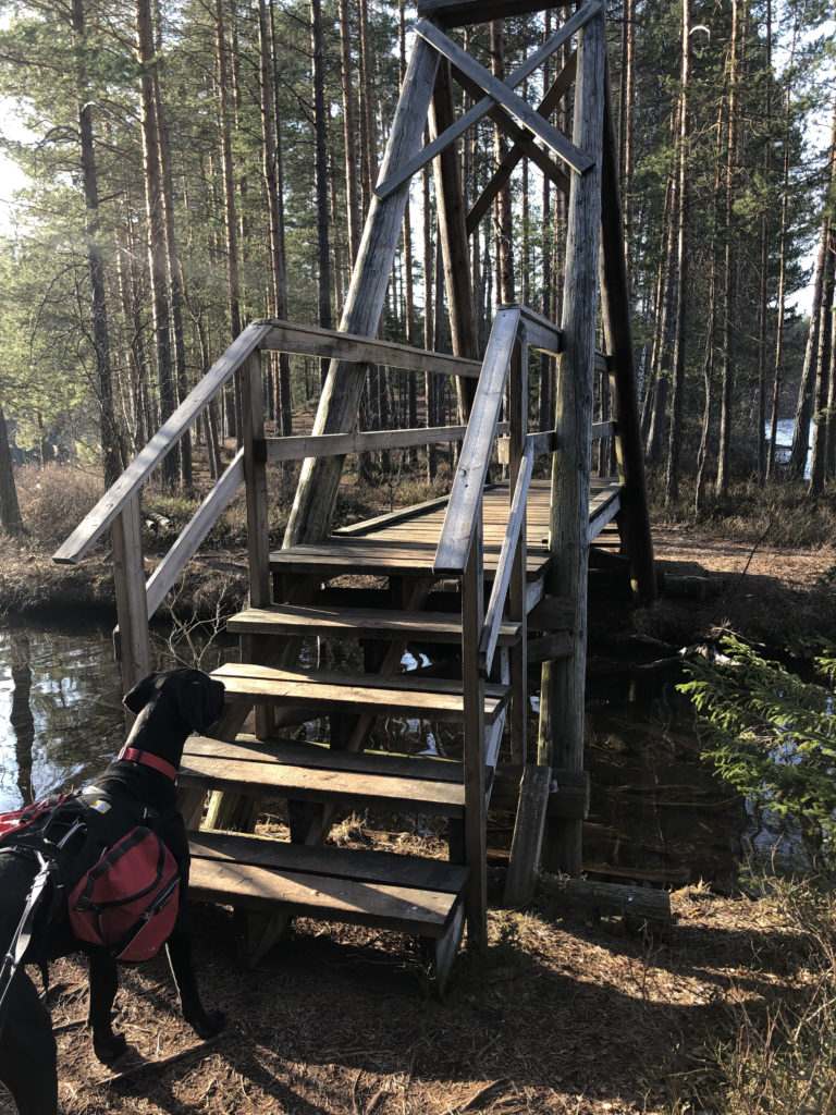 Aikansa kuljettuamme järven rantaa pitkin, polku kääntyi ja näytti kuin kulkevan suoraan järveen. Se muuntuikin hyvin ovelasti pitkäksi ja kapeaksi kannakseksi, joka yhdistyi toiselle rannalle sillan ja ehkä noin kymmenmetristen pitkospuiden avulla. Vesi taisi hieman korkealla, sillä pitkokset olivat osittain veden alla, ja lisäksi ne niiasivat syvemmälle niillä kävellessä. Nemi pääsi siis ylittämään itsensä totaalisesti, sillä se joutui Kastelemaan Varpaansa Hukkumiskuolemaa Uhaten! Edelläni se ei suostunut kävelemään, mutta perässäni se tallusteli kuitenkin hyvinkin kiltisti ja yhteistyökykyisesti vesiesteen yli. Sen verran syvällä käytiin, että puntinlahkeet kastuivat. Onneksi oli korkeavartiset ja vedenpitävät kengät 🙂