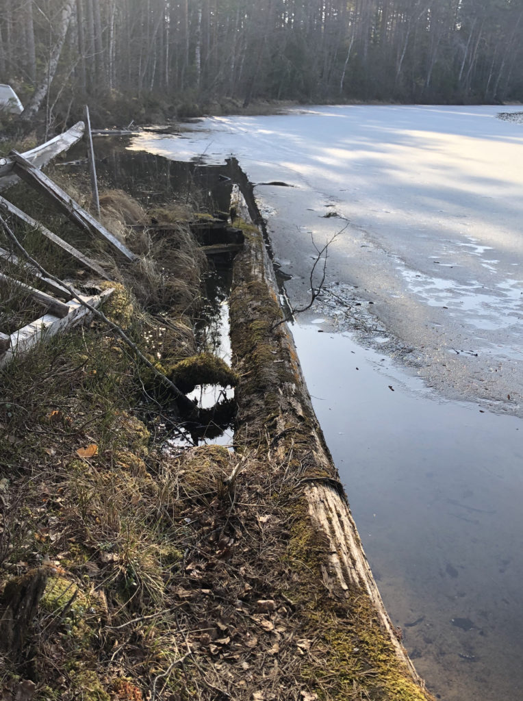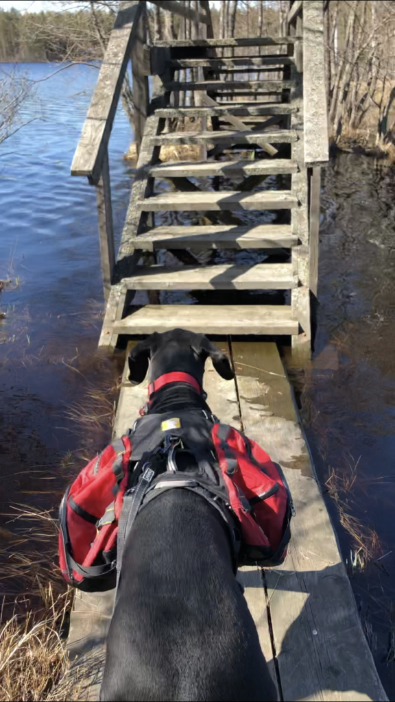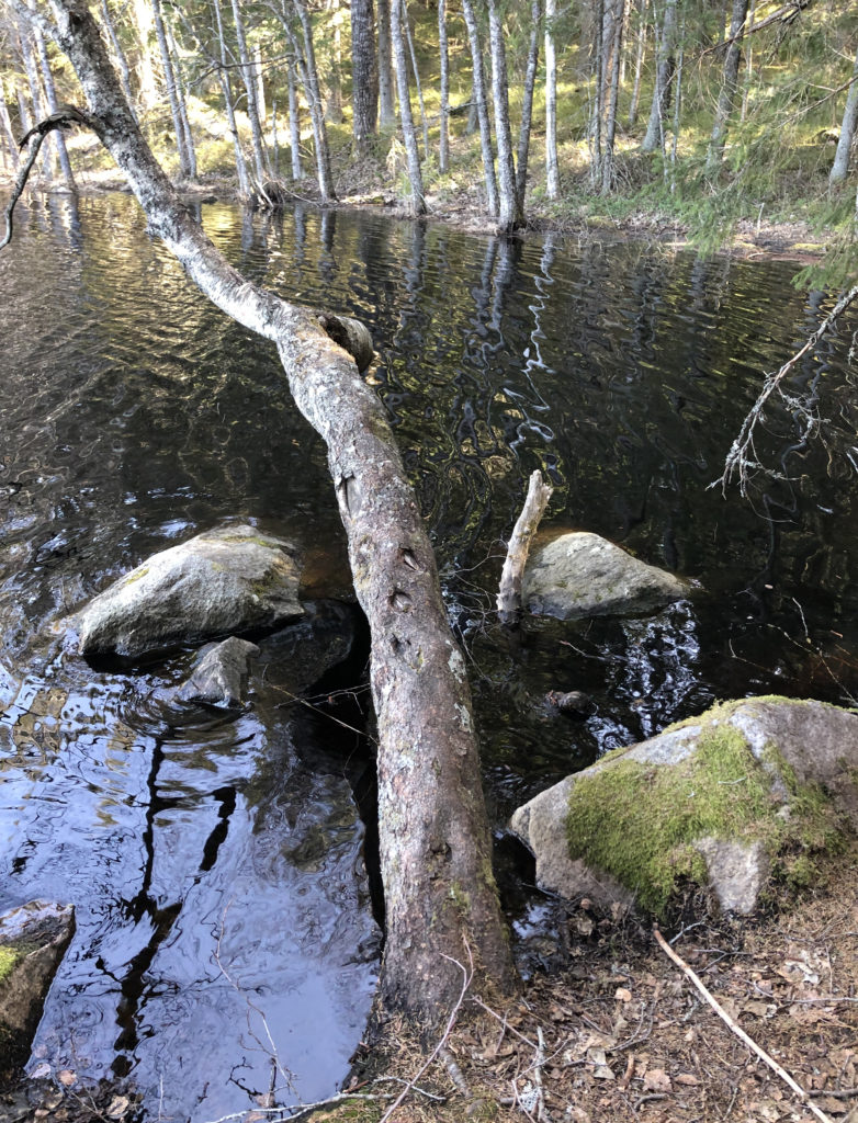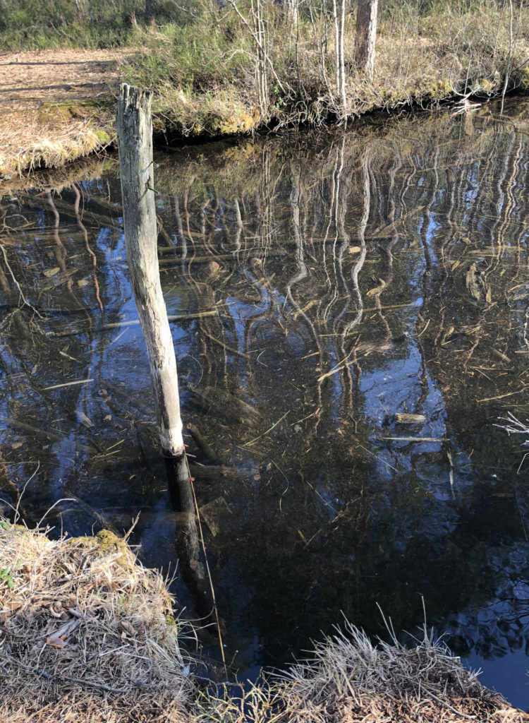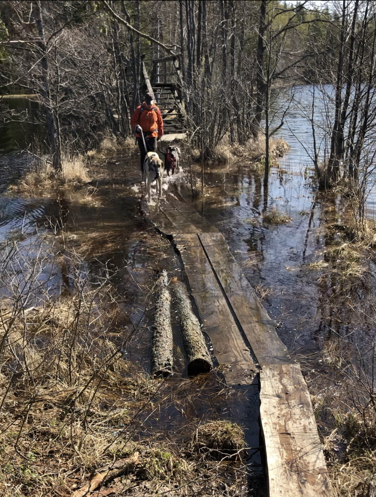 Aikansa kuljettuamme järven rantaa pitkin, polku kääntyi ja näytti kuin kulkevan suoraan järveen. Se muuntuikin hyvin ovelasti pitkäksi ja kapeaksi kannakseksi, joka yhdistyi toiselle rannalle sillan ja ehkä noin kymmenmetristen pitkospuiden avulla. Vesi taisi hieman korkealla, sillä pitkokset olivat osittain veden alla, ja lisäksi ne niiasivat syvemmälle niillä kävellessä. Nemi pääsi siis ylittämään itsensä totaalisesti, sillä se joutui Kastelemaan Varpaansa Hukkumiskuolemaa Uhaten! Edelläni se ei suostunut kävelemään, mutta perässäni se tallusteli kuitenkin hyvinkin kiltisti ja yhteistyökykyisesti vesiesteen yli. Sen verran syvällä käytiin, että puntinlahkeet kastuivat. Onneksi oli korkeavartiset ja vedenpitävät kengät 🙂