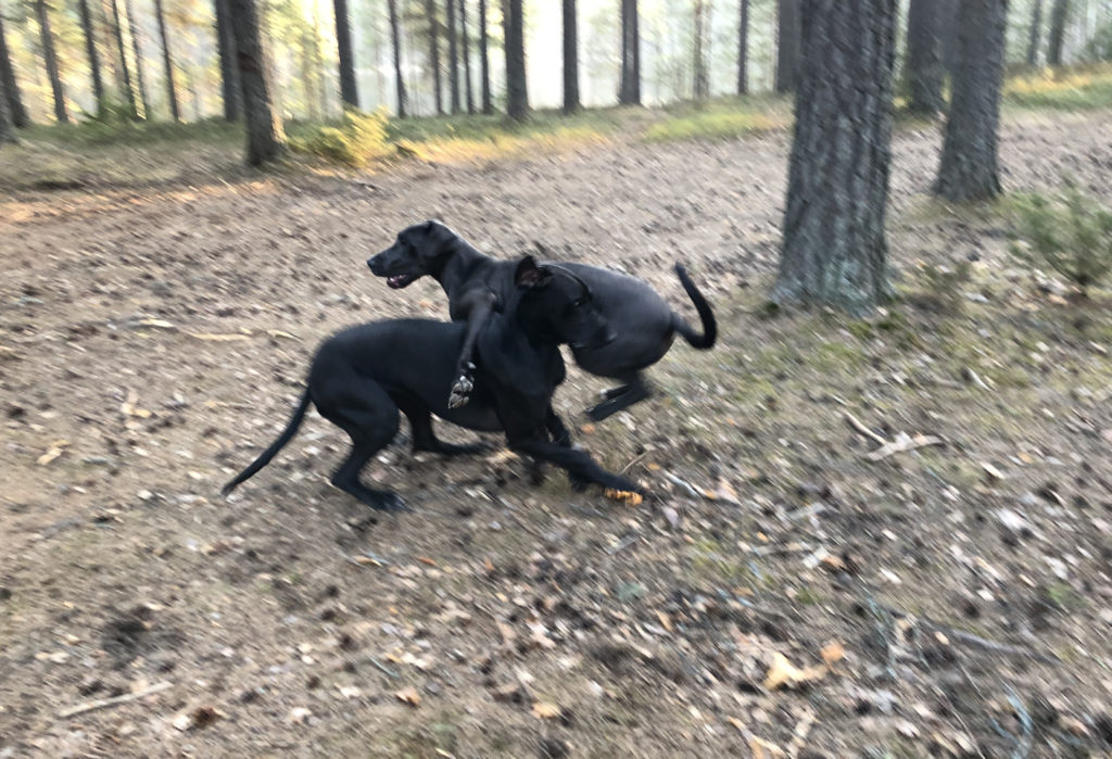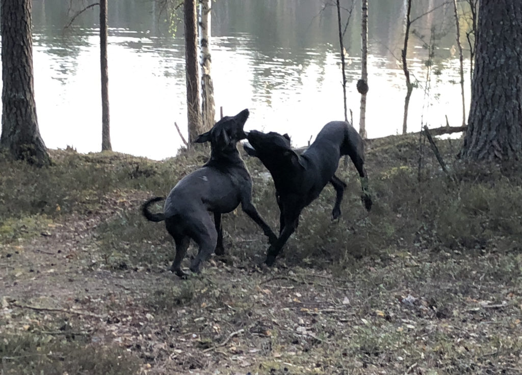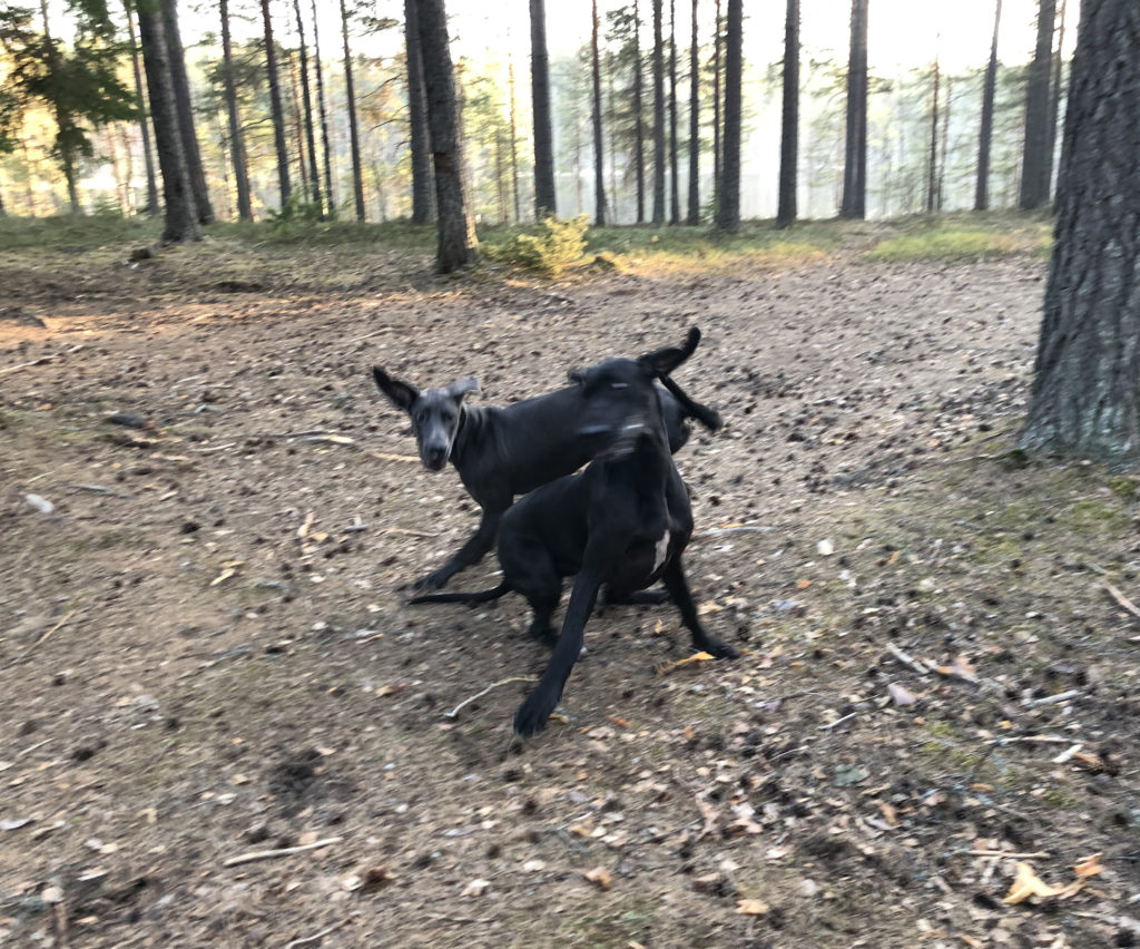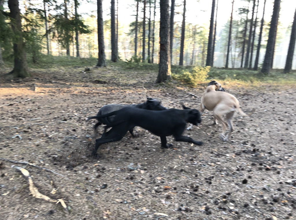 Uni maistui minulle jopa melkoisen hyvin. Seuraavana aamuna sain kuulla, että meidän koiratriomme kahdella nuorimmalla oli ollut aamuvarhaisella vähän juttua; Nemi oli ollut kiltisti paikallaan ja liikkumatta, mutta silti hereillä – ja Hekla huomasi sen, ja jäi odottamaan ja tuijottelemaan toiveikkana Nemiä. Nemin ei ollut kuulemma tarvinnut kuin kohottaa kulmakarvojaan, niin Hekla oli ollut ihan jousilla lähdössä telttapainiin kaverin kanssa, ja Niina oli saanut komentaa kakaraa aloilleen. Mitä ilmeisimmin Nemi oli tarttunut tilaisuuteen, ja ihan kiusallaan huudellut Heklalle äänettömästi – edelleen, paikallaan maaten, liikkumatta – kaikenlaisia lällättelyjä, sillä Niina oli saanut komentaa Heklaa useampaankin otteeseen asettumaan aloilleen.