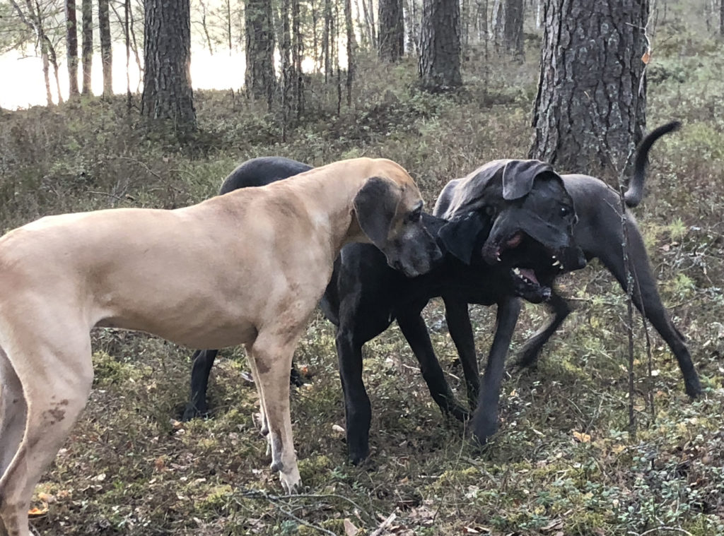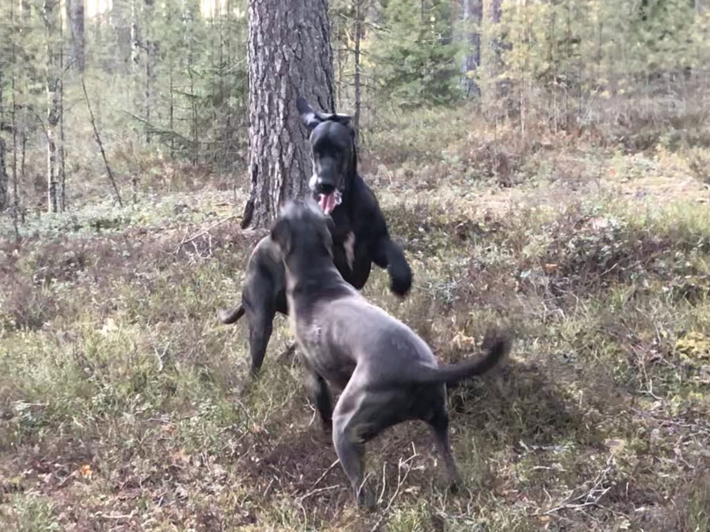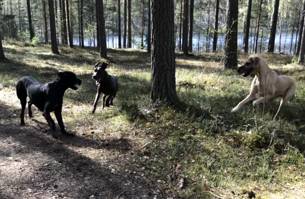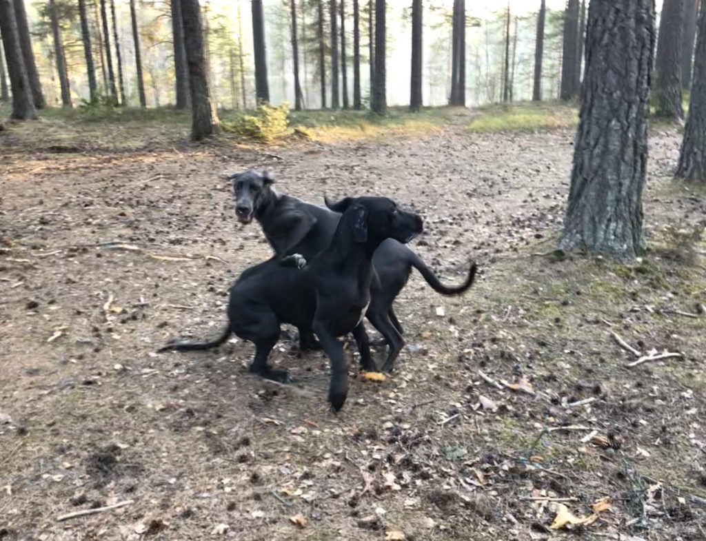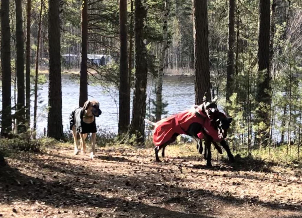 Uni maistui minulle jopa melkoisen hyvin. Seuraavana aamuna sain kuulla, että meidän koiratriomme kahdella nuorimmalla oli ollut aamuvarhaisella vähän juttua; Nemi oli ollut kiltisti paikallaan ja liikkumatta, mutta silti hereillä – ja Hekla huomasi sen, ja jäi odottamaan ja tuijottelemaan toiveikkana Nemiä. Nemin ei ollut kuulemma tarvinnut kuin kohottaa kulmakarvojaan, niin Hekla oli ollut ihan jousilla lähdössä telttapainiin kaverin kanssa, ja Niina oli saanut komentaa kakaraa aloilleen. Mitä ilmeisimmin Nemi oli tarttunut tilaisuuteen, ja ihan kiusallaan huudellut Heklalle äänettömästi – edelleen, paikallaan maaten, liikkumatta – kaikenlaisia lällättelyjä, sillä Niina oli saanut komentaa Heklaa useampaankin otteeseen asettumaan aloilleen.