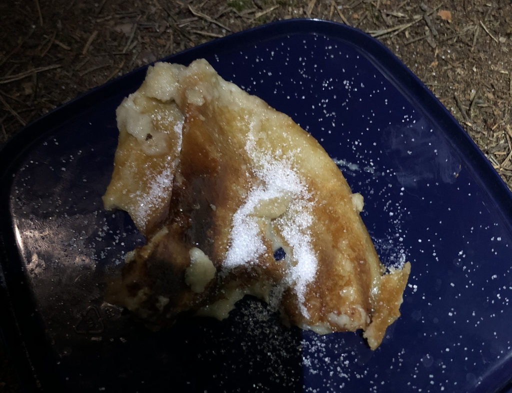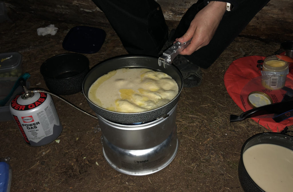Illan laskeutuessa valmistelimme ruokia – tortillat onnistuivat vallan mainiosti ja olivat täyttäviä ja hyviä päiväretken päätteeksi, mutta hyvä yrityksemme lettujen paistamsesta jäi hyväksi yritykseksi – taikina (yhdistettynä Trangian keskitettyyn tuleen?) ei nyt vaan toiminut. Loppujen lopuksi päätimme yrittää valmistaa valtavasta määrästä lettutaikinaa edes yksi lätty, joka olisi jotain lettujen ja pannarin välimaastosta – ja se saikin sitten nimeksensä jännäri. Maku oli periaatteessa ihan hyvä, mutta ulkonäkö… koettakaa olla näkemättä painajaisia 😀 Mutta, tätä jännäriä valmistettiin tunteella ja huolella Trangian kaasuliekin alla pitkälti yli tunti, joten yritteliäisyyttä ei ainakaan puuttunut! Huomaa muuten jo hämärtyvät kuvausolosuhteet: Jännäri saatiin valmiiksi otsalamppujen valaistuksessa klo 23.
