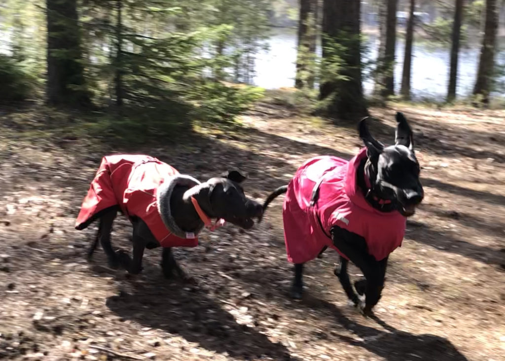 Me keräilimme teltat ja tavarat kasaan, ja kun koirien mahat olivat tarpeeksi laskeutuneet, oli aika päästää trio taas verryttelemään (heh, jotenkin se nollasta sataan -kiihdytysspurttailu on niin kovin kaukana verryttelystä… :)). Myös koirilla pidettiin yökkärit päällä, ihan kuten meilläkin, ja otettiin vasta asteittain pois kun saatettiin olla varmoja, etteivät ne palelisi yön kohmeisuuden jäljiltä.
