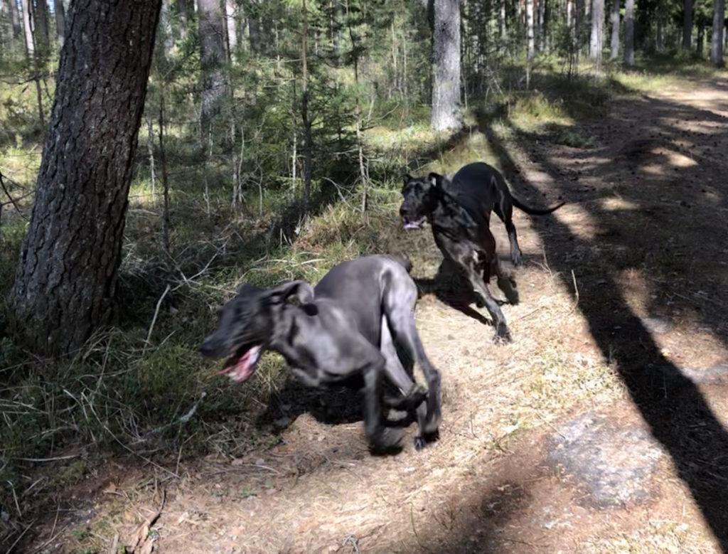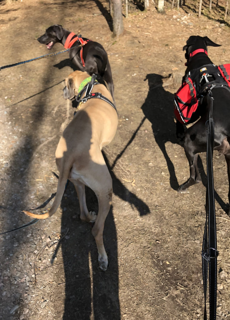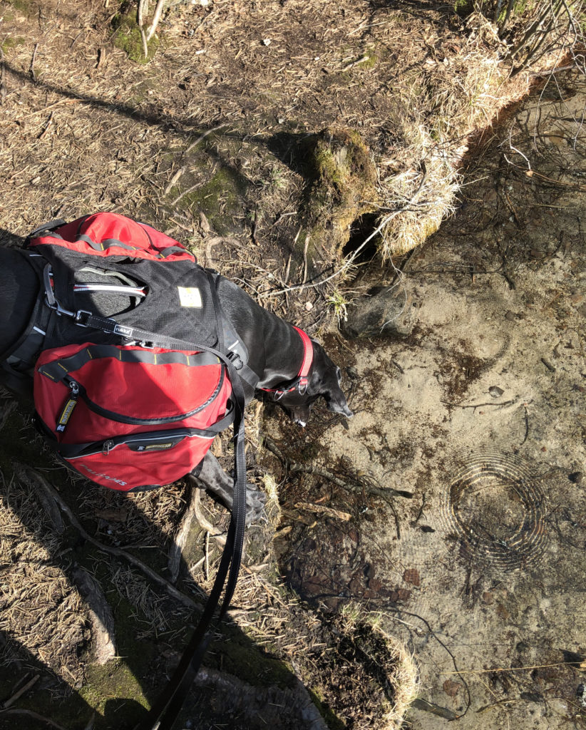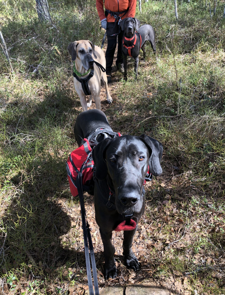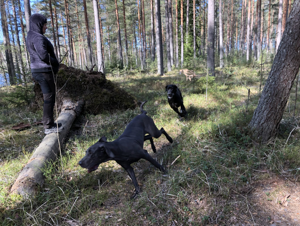 Kävely itsessään sujui oikein mallikkaasti: Nemi kuunteli todella hienosti ohjeita ja käskyjä. Siltojen ylittäminen sujui tottuneesti, ja myös toiset ulkoilijat koirineen ohitettiin ilman suurta draamaa. Huomion arvoista oli myös se, että päivä oli sen verran lämmin, että Nemi suostui myös juomaan luonnonvesistä – ihan vallan tassujen kastumisen uhallakin! 😉 Myös Niinan ja likkojen kulku sujui pääsääntöisesti oikein hyvin: Pennihän nyt on vuorenvarma konkaritallustelija, mutta kovasti aktiivinen, vuoden ikäinen Hekla-tornado tarvitsee vielä vähän ikää ja älliä päähänsä 🙂 Ennakkoon pohdituista kauhukuvista ärräpäiden täyteisistä lenkeistä oltiin kaukana, ja kävely aurinkoisen lämpimässä säässä ja upeissa maisemissa oli kertakaikkisen ihanata!