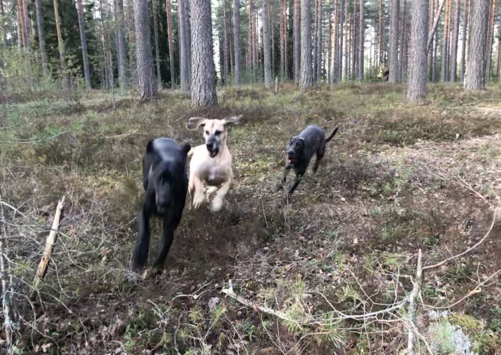 Meillä oli pari yöpymisvaihtoehtoa mielessä; toinen oli tässä Melkuttimen laavualueella, mutta koska sinne oli jäämässä muitakin yöpyijä, päätettiin me pakata itsemme autoon ja etsiä oma rauha. 🙂 Niinalla oli tiedossa hyvä spotti Vääriän rannalla, ja sinne me leirimme rakensimme. Koirat saivat vähän vielä irrotella alueella, ja… noh. Nehän sitten menivät just niin kovaa, kun olettaa voi. Ihme että kamera pysyi mukana 😀