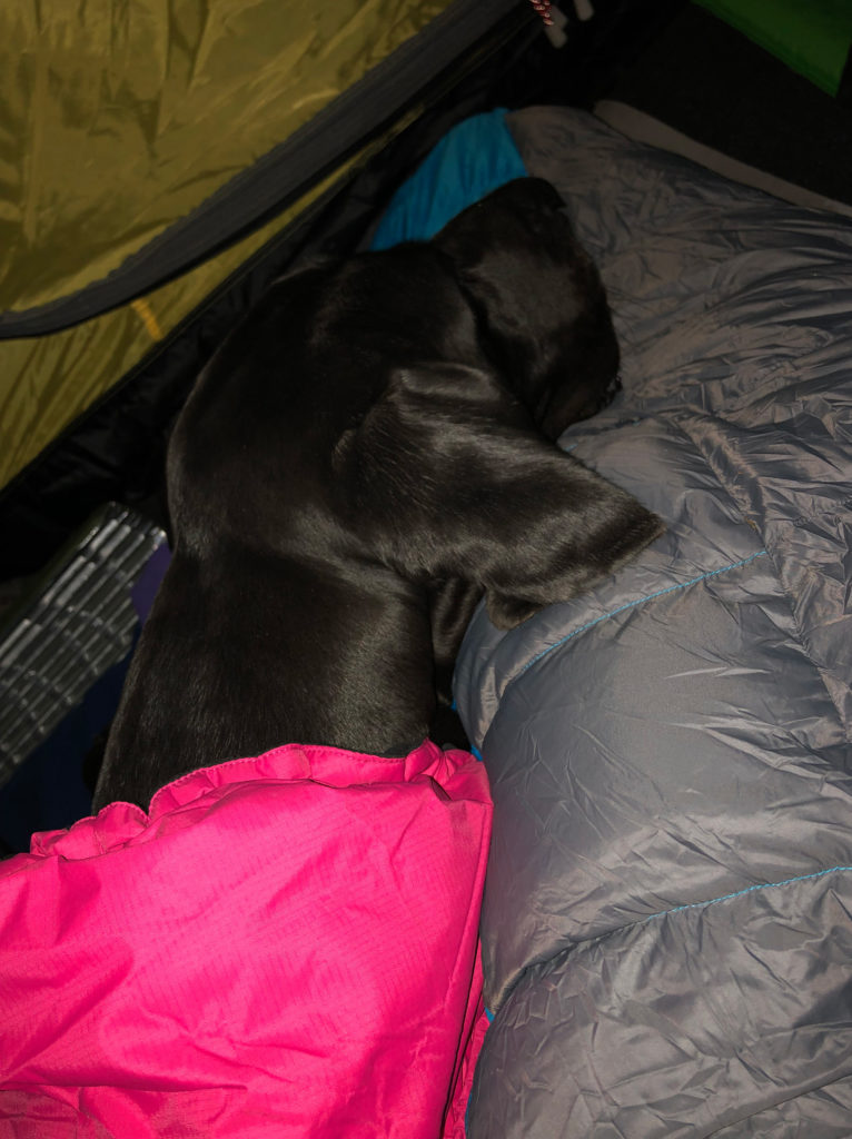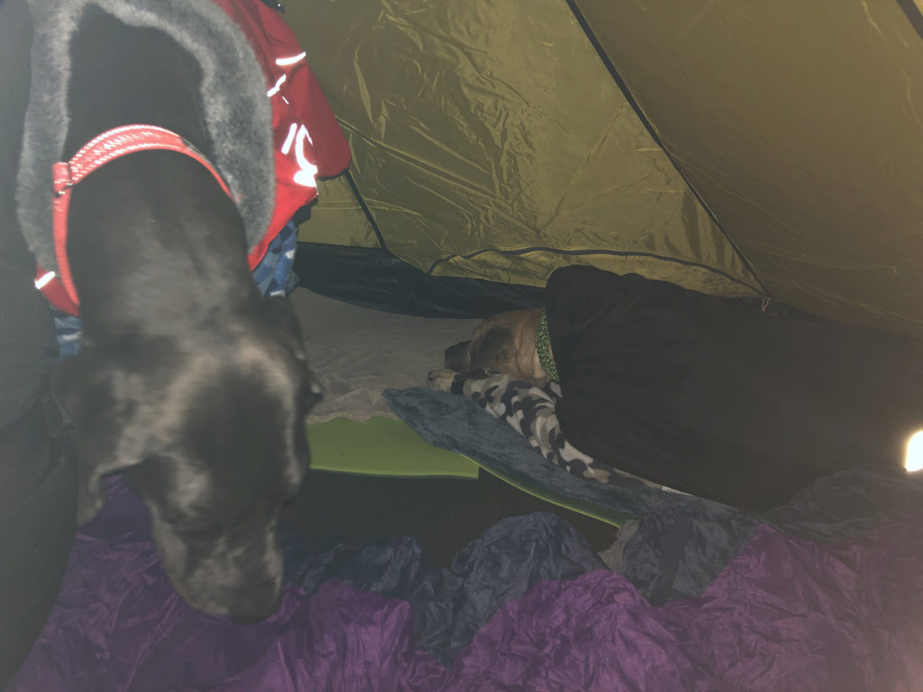 Asemoiduimme isoon kotatelttaan niin, että me ihmiset nukuimme keskellä ja koirat ulkolaidoilla. Nemin yövarustukseen kuului teltan pohjalla kaksi kerrosta retkipatjoja, sitten Nemin oma matkapeti (vanutäytteinen patja, jonka päällä fleecepeitto) ja koiralla oli yllään Hurtan pitkäpunttinen fleecehaalari sekä toppatakki. Jossain vaiheessa yötä vedin Nemille kaulaan TopCanisin paksusta froteesta tehdyn tuubihuivin. Yö telttamme ulkopuolella oli tuulinen ja lämpötila alimmillaan nollassa.
