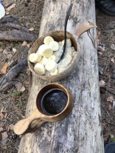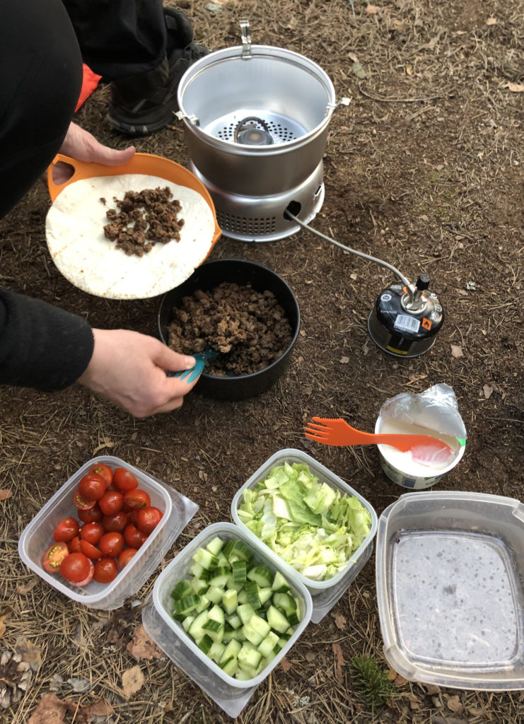 Aamu alkoi aurinkoisena, mutta melko viileänä ja tuulisenpuoleisena. Aamupalaa rakennettiin ja syötiin koko toppavaatevarustus päälle puettuna, ennen kuin kroppa alkoi herätä ja aurinko lämmittää edes hieman. Taisin muuten syödä toistaiseksi parhaimman retkiaamupalan, ja kuvakin on kuin suoraan jostain retkilehden kannesta: