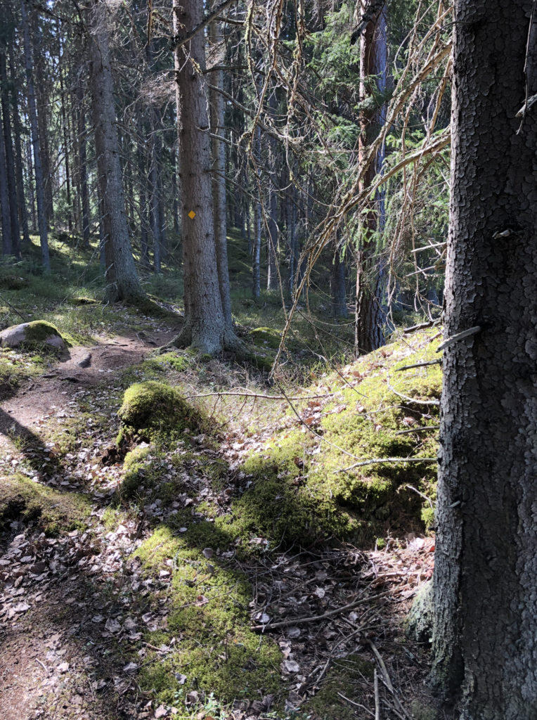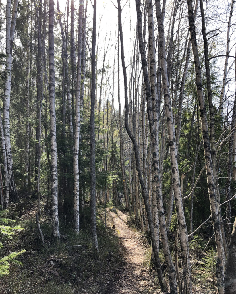 Pääjärven reitti alkaa kulkemalla järven reunuksia pitkin, mutta eriytyy jossain vaiheessa pois järven luota kulkien hetkittäin jopa autoteiden vieressä ja jopa niiden yli. Loppujen lopuksi, maasto oli ihanan vaihtelevaa – järvimaisemaa ja vesiesteitä, pitkospuita, ihania vihreitä sammalmetsiä, lukuisia ojanpenkereiden ylityksiä pieniä siltoja pitkin, koivumetsää, ja mahtui reitille jopa pari pientä nousuakin. Jotenkin todella kiva reitti, eikä täällä edes törmätty muihin ulkoilijoihinkaan.