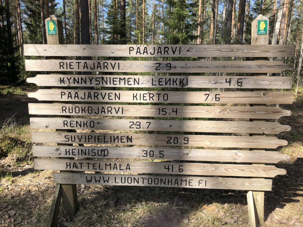 Sitten oli aika suunnistaa tulevan päivän seikkailuihin! Seuraava kohteemme ei ollut kauhean kaukana, ja ajelimme hetken matkaa Pääjärven parkkialueelle. Olimme aiemmin löytäneet tietoa noin neljän kilometrin matkasta, mutta opastetaulu osasi kertoa myös vaihtoehtona 7,5 km järvenkierron reitistä. Se kuulosti paljon sopivammalta meille, ja pienten selvittelyjen jälkeen päätettiin sitä lähteä kiertämään.