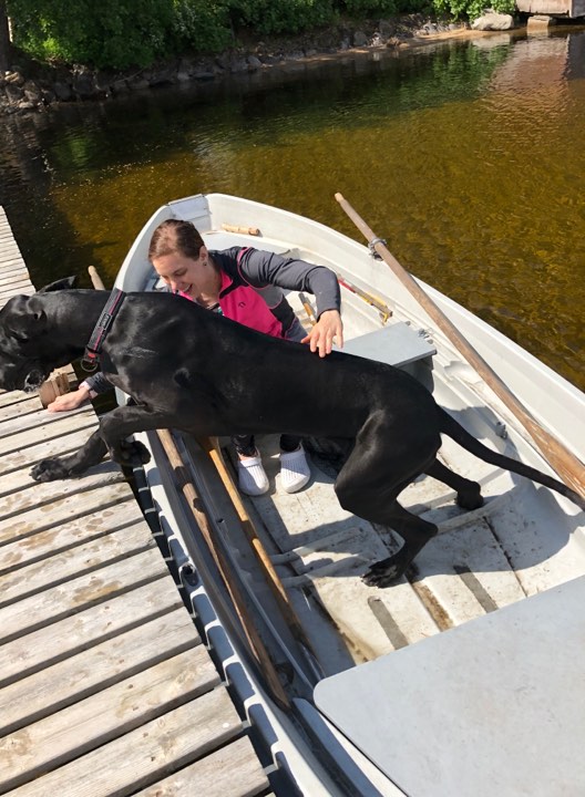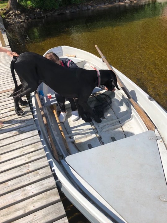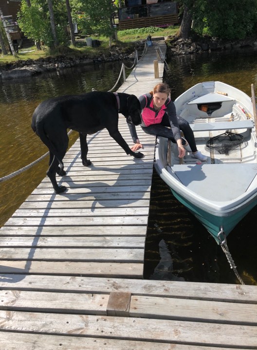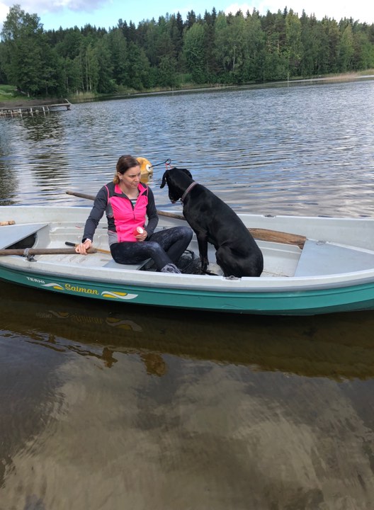 Viime viikonloppuna me käytiin aloittamassa mökkikausi! Ja jotta saatiin heti verestettyä opittuja asioita, tuuppasin Nemin veneeseen. …No en tuupannut, mutta houkuttelin riittävän hyvillä herkuilla. Ekana päivänä houkutelua sai tehdä jonkin aikaakin, mutta kärsivällisyys palkittiin (ja herkut olivat liian vastustamattomia), ja Nemi saatiin tulemaaan omatoimisesti veneeseen. Seuraavana päivänä veneeseen kulku saatiin jo niin helpoksi, että loppujen lopuksi sain koiran hyppimään ees-taas veneelle ja laituriin. Hieno, hieno tyttö!