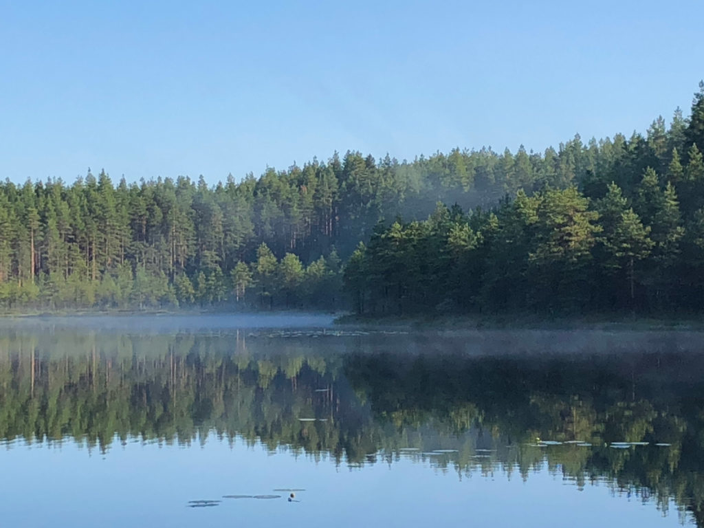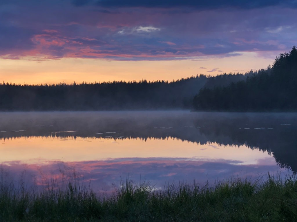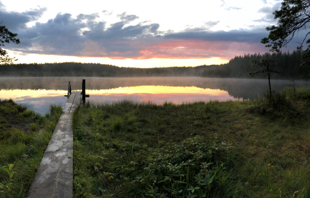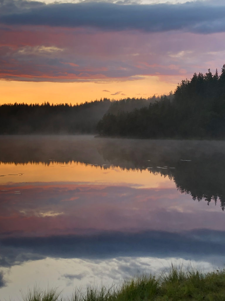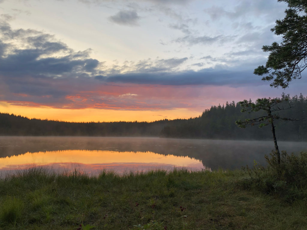 Viimein sade alkoi hellittää ja ilmanala muuttua. Minäkin sain kaivettua kameran uudestaan esiin – todettuani ensin, että se ei ollut kärsinyt mainittavia kosteusvaurioita takkini taskussa. Ja voi miten upeita iltakuvia Kirkaslammelta saatiinkaan! Järvi höyrysi, aurinko punasi taivaanrannan, ilma oli sateen jälkeen kuulas ja raikas… ahhh <3 Enää ei harmittanut yhtään, että aiemmin oli vähän kastuttu.