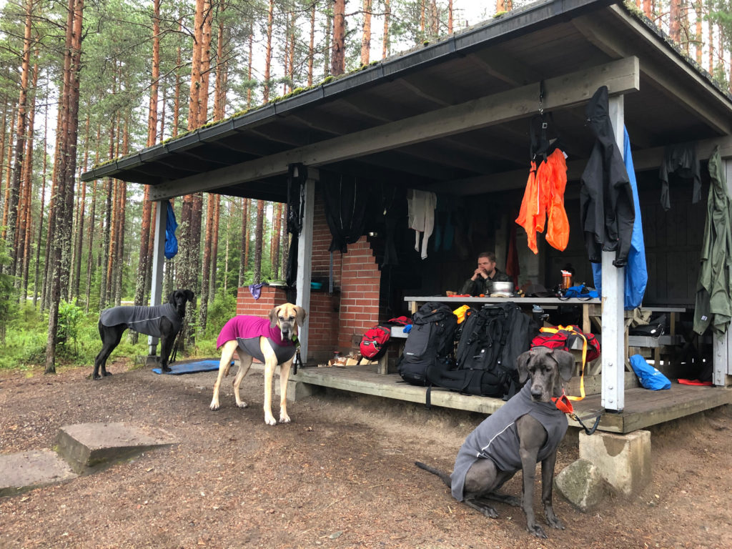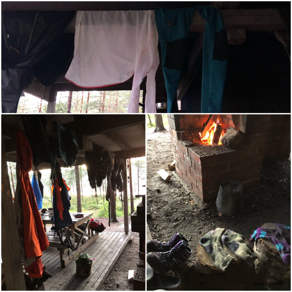 Kävelimme märässä maastossa, kuunnellen päähän ropisevia isoja pisaroita sekä ukkosta yllämme, kunnes saavuimme Kirkaslammen risteykseen ja havaitsimme, että siellä olisi katettu tulipaikka. Jes! Juuri se, mitä märkien varusteiden kanssa tarvittaisiin! Tulipaikalla oli pari muutakin retkeilijäryhmää lämmittelemässä ja kuivattelemassa tulen äärellä. Vaihdoimme heti kuivat merinovillavaatteet ylle, samoin kuin koirille kuivaa ja lämmintä päälle, ja levittäydyimme hyvin tehokkaasti kuivattelemaan kolmen ihmisen ja kolmen ison koiran läpimäriksi kastuneita varusteita. Tämä olisi hyvä paikka; tähän jäätäisiin yöksi.