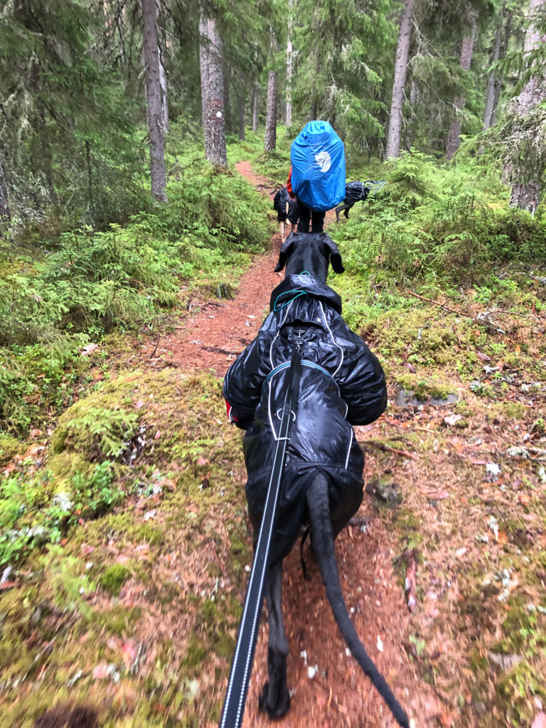 Lähdimme matkaan totuttelemaan painaviin rinkkoihimme, ja katselimme hieman huolestuneena edessämme aukeavia kovin synkän näköisiä pilviä. Olimme ehtineet taivaltaa noin kilometrin matkan, kun pieni saderintama pyyhkäisi ylitsemme. OK, selvittiin vielä kuivin nahoin. Hetken kuluttua sade kuitenkin yltyi, ja sitten tulikin jo kiire varustaa itsemme ja koirat sadevaatteisiin. Sitten alkoi ukkonen jytistä.