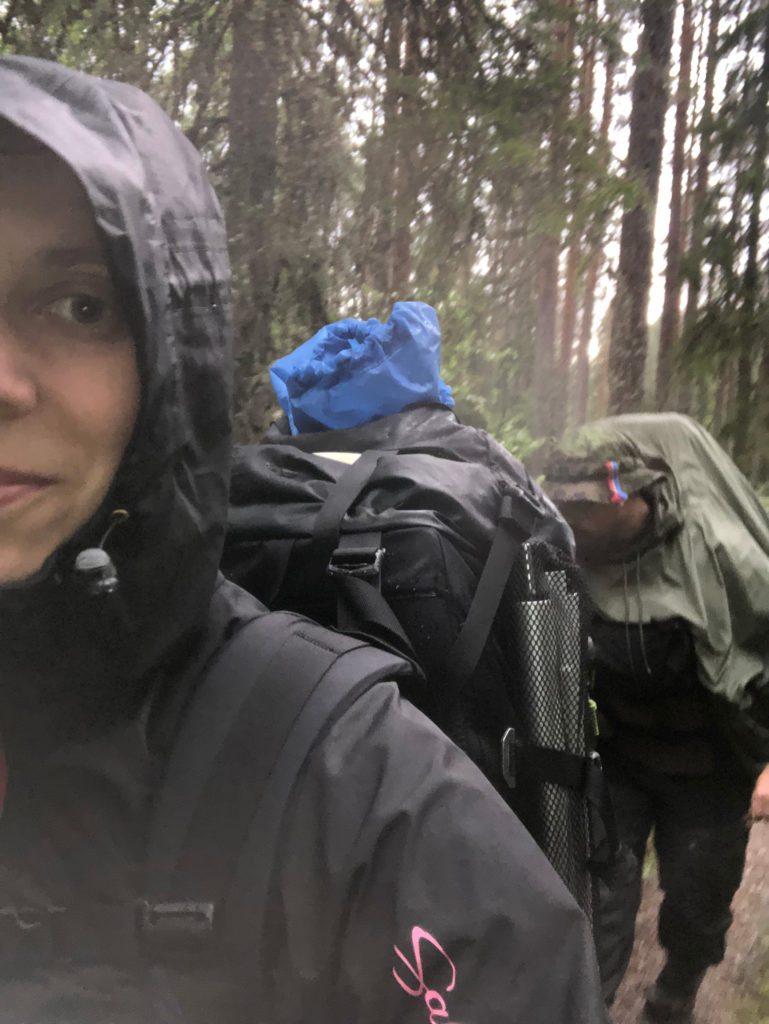 Mutta, riittääkö tämä kuvaamaan jotakin niskaan saaamastamme sateen määrästä? Voin kertoa, etten muista milloin viimeksi olisin kastunut näin pahasti. Kaikkia vaatekerroksia myöten. Me kaikki kastuimme, vähän eri syistä: Minun vuosia palvellut goretex-takkini olkasaumaukset pettivät väärällä hetkellä, eikä sadevarustukseni ollut muutenkaan täysin pitävä. Mikko joutui toteamaan suunnittelemansa sadeviittaratkaisun vielä parantelua vaativaksi. Niinalla meni tovi saada koiransa, itsensä ja rinkkansa sadevaatteiden suojiin, ja he taisivat kastua jo siinä vaiheessa.