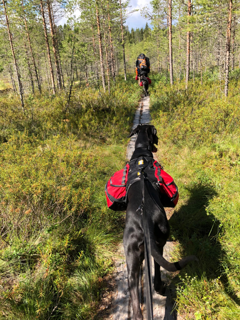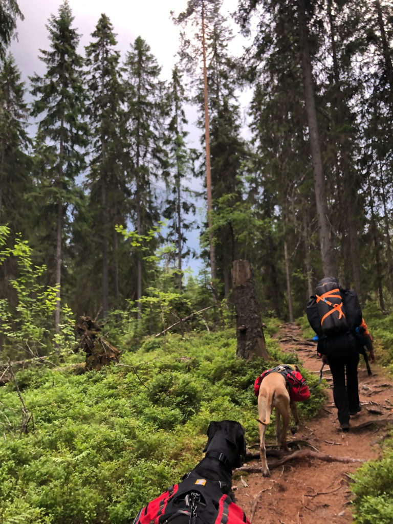 Rinkkoja emme muistaneet punnita lähtiessä; omani veikkaan painaneen yli 15 kg ja Mikon rinkka vielä enemmän. Nemi kantoi omassa rinkassaan ruokansa, yöhaalarinsa sekä pienen setin koira-EA-tarvikkeita. Nemin rinkan yhteispainona arvioin olleen kolmen ja neljän kilon väliltä.