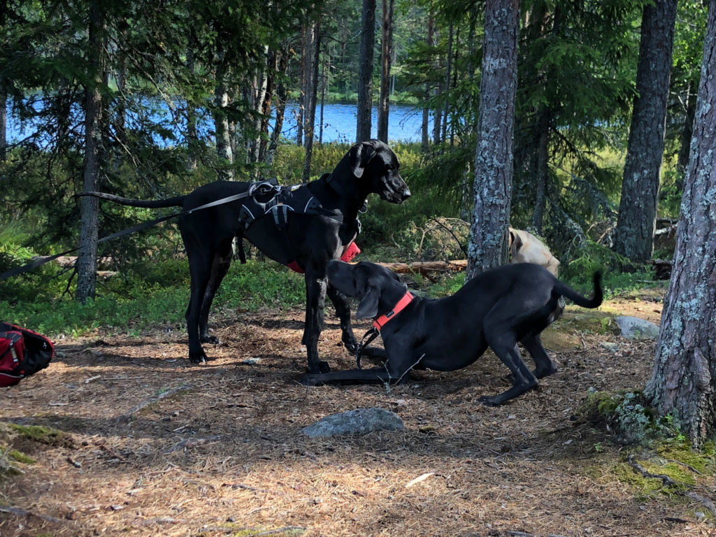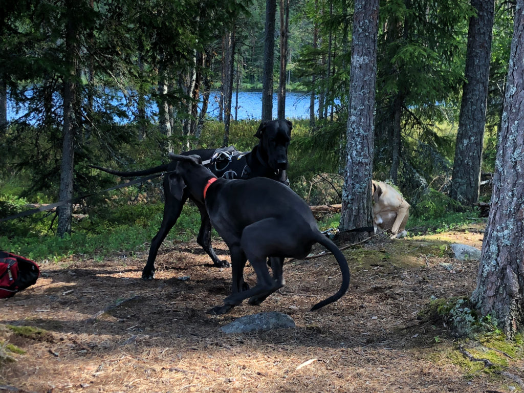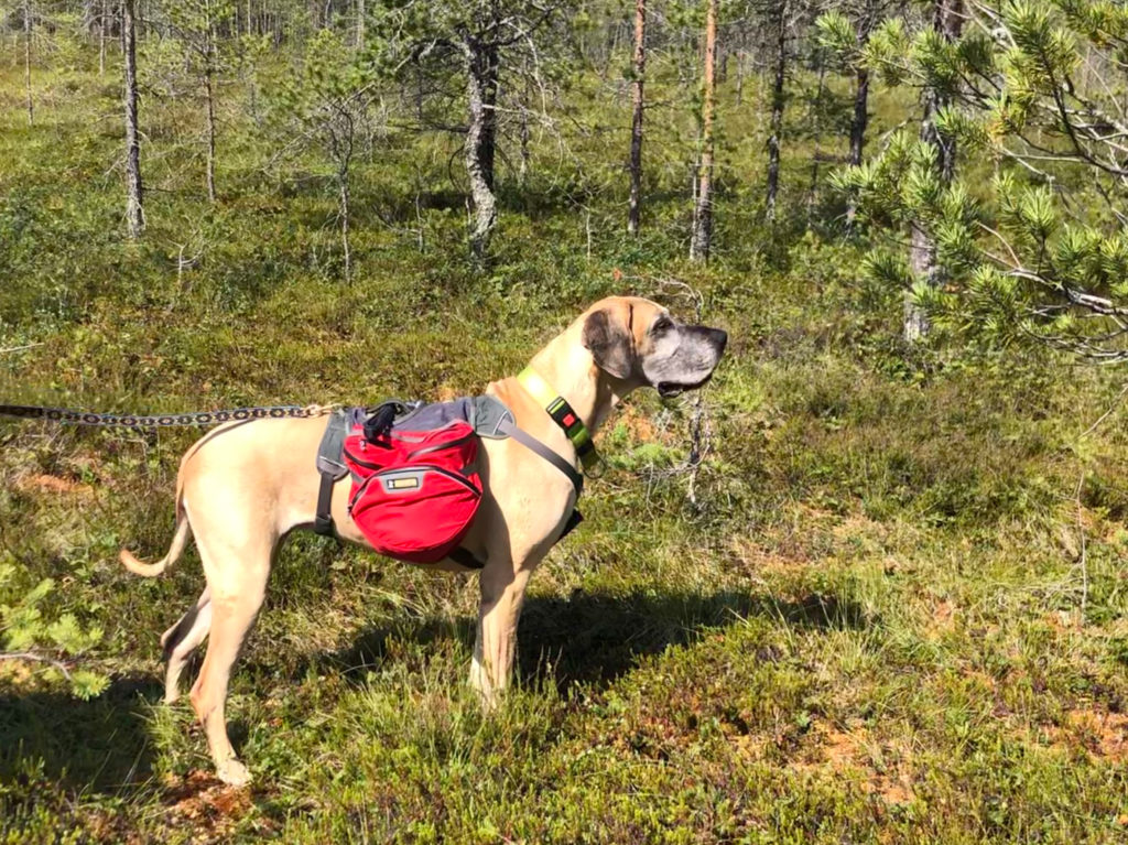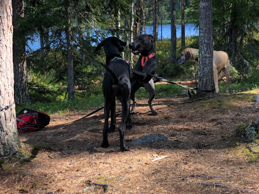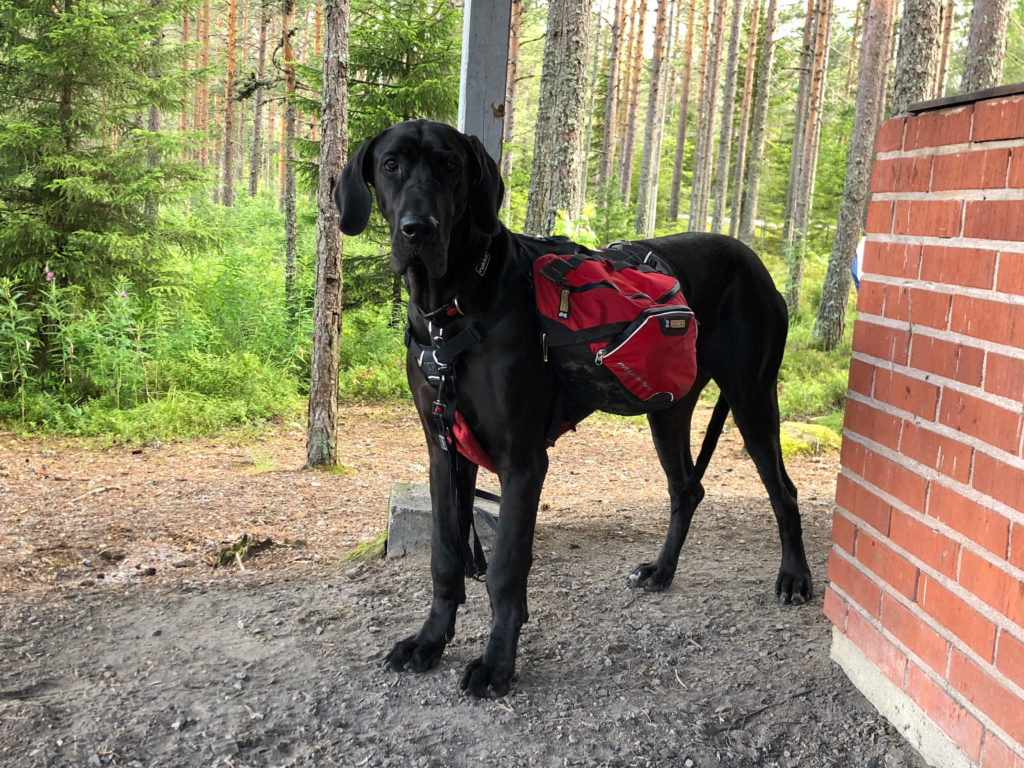Toisekseen, tämä oli ensimmäinen kerta, kun kukaan meistä oli vaellusretkellä kahta yötä putkeen. Jouduimme yhteen ääneen toteamaan, että tanskandoggi ei valitettavasti ole se käytännöllisin koirarotu vaelluskaveriksi – tarvittava ruokamäärä on iso ja se painaa; koira tarvitsee vaatetusta (sadevaatteet JA lämpöiset vaatteet) sekä pedin tai patjan, ja kaikki nämä vievät rinkassa tilaa ja painavat myös. Ja luonnollisesti, jotta mahdut ison koirasi (koiriesi) kanssa telttaan, et voi pakata pientä ja käytännöllistä telttaa, vaan tarvitset vähintään kolmen hengen teltan -> jälleen kerran sama tilanne tilan ja painon suhteen. Kun kantaa rinkassaan omat tarvikkeet ja ruoat sekä valtaosan tanskandogin retkeilytarvikkeista, niin rinkan paino lähtiessä on tosiaan lähempänä kahtakymmentä kuin viittätoista kiloa. Ja tällä kertaa ei pakattu mukaan edes vesiä yhtä juomapullollista enempää. (Ja hatunnosto Niinalle: Minä ja Mikko jaamme kahdestaan kannettavat tavarat kahdelle ihmiselle ja yhdelle koiralle, Niina kantaa yksinään yhden ihmisen ja kahden koiran tavarat! Huhhuh, kova mimmi!)