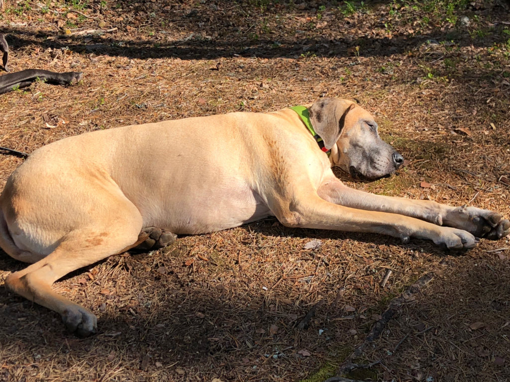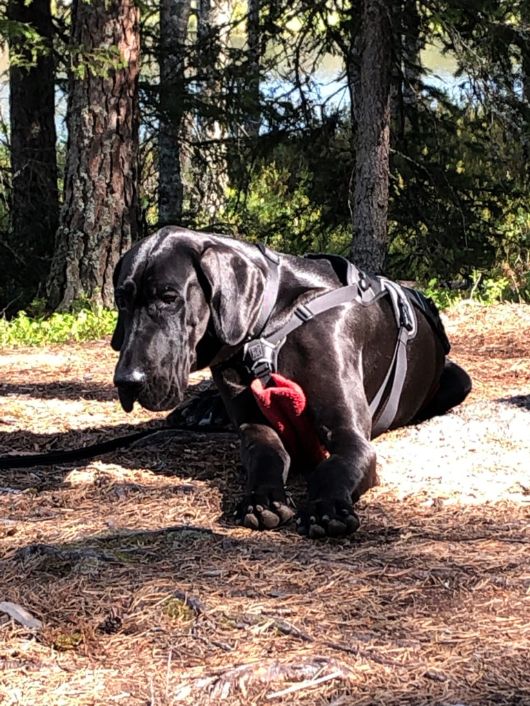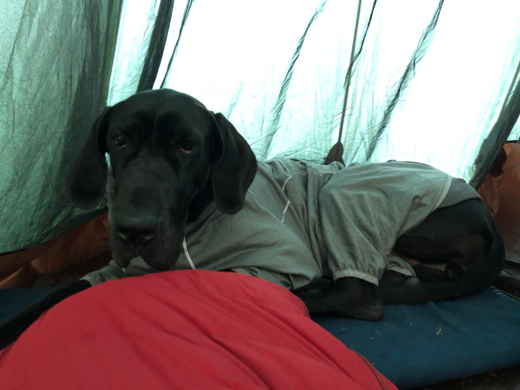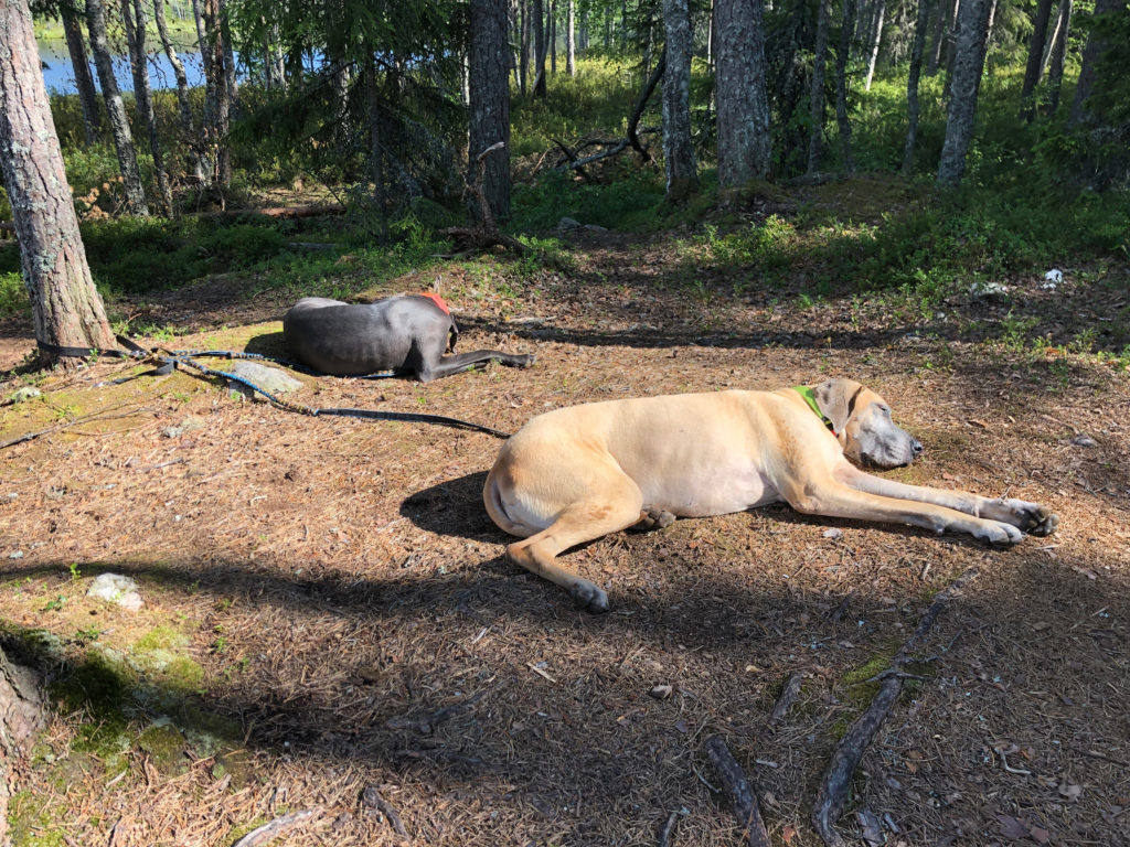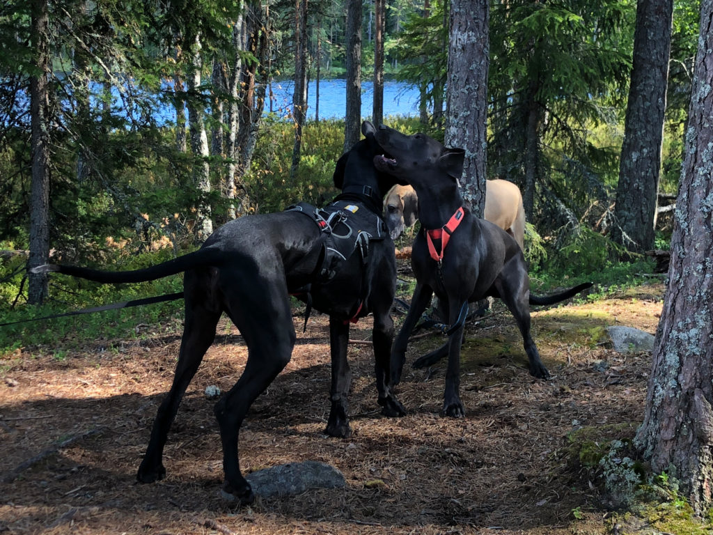 Toisekseen, tämä oli ensimmäinen kerta, kun kukaan meistä oli vaellusretkellä kahta yötä putkeen. Jouduimme yhteen ääneen toteamaan, että tanskandoggi ei valitettavasti ole se käytännöllisin koirarotu vaelluskaveriksi – tarvittava ruokamäärä on iso ja se painaa; koira tarvitsee vaatetusta (sadevaatteet JA lämpöiset vaatteet) sekä pedin tai patjan, ja kaikki nämä vievät rinkassa tilaa ja painavat myös. Ja luonnollisesti, jotta mahdut ison koirasi (koiriesi) kanssa telttaan, et voi pakata pientä ja käytännöllistä telttaa, vaan tarvitset vähintään kolmen hengen teltan -> jälleen kerran sama tilanne tilan ja painon suhteen. Kun kantaa rinkassaan omat tarvikkeet ja ruoat sekä valtaosan tanskandogin retkeilytarvikkeista, niin rinkan paino lähtiessä on tosiaan lähempänä kahtakymmentä kuin viittätoista kiloa. Ja tällä kertaa ei pakattu mukaan edes vesiä yhtä juomapullollista enempää. (Ja hatunnosto Niinalle: Minä ja Mikko jaamme kahdestaan kannettavat tavarat kahdelle ihmiselle ja yhdelle koiralle, Niina kantaa yksinään yhden ihmisen ja kahden koiran tavarat! Huhhuh, kova mimmi!)