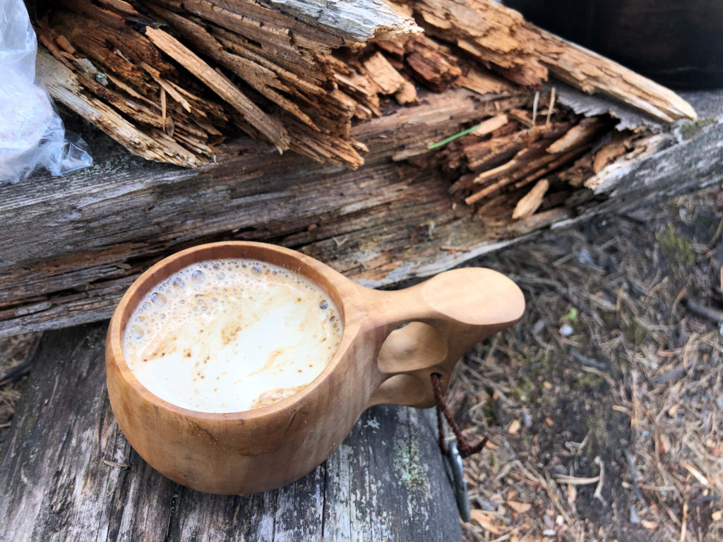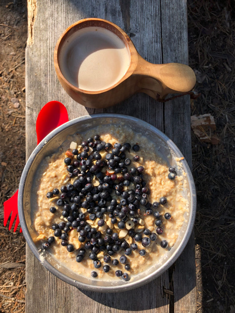 Kolmas aamu Seitsemisissä valkeni kauniina ja aurinkoisena. Ei lainkaan huonompi paikka syödä aamupuuroaan, vai? 😉 Nyt täytyy muuten antaa hyvä vinkki kahvihommiin: näin isolla tavaramäärävarustuksella päätimme jättää nokipannun kotiin, ja “tyytyä” pikakahvijauheisiin. Kaupasta matkaamme tarttuikin cappuccinojauhe – eli maitokin jo valmiiksi mukana! Cappuccino oli vallan kelvollista, eli tämä idea jää meillä jatkokäyttöön!