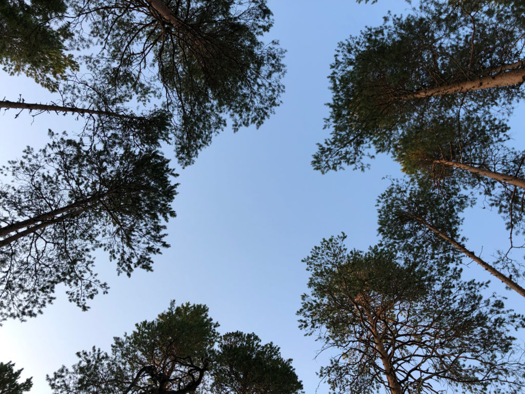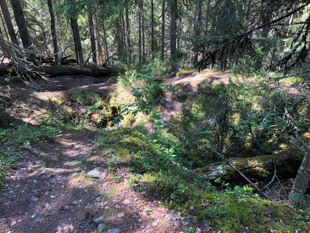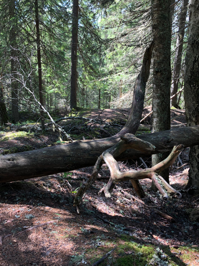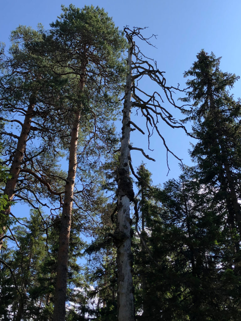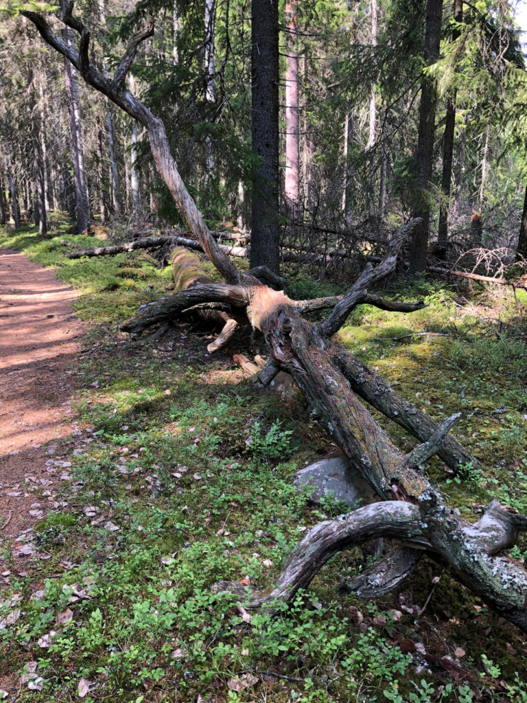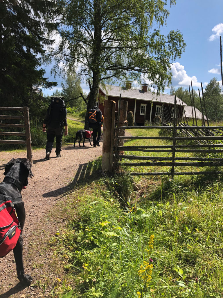Jos ensimmäisen päivän reitti oli enemmän metsäisempää maisemaa ja sisälsi myös reitin isoimman nousun, oli toinen kävelypäivä erilaisten kelopuiden sävyttämää. Että ne voivat olla hienoja luonnon taideteoksia! Muutoinkin maisemat olivat ihania. Reittimme vei myös läpi Koveron perinnetuvan, jonka pihamaalla täydensimme vesivarastot täyteen pihakaivosta, ja siinä ihmetellessä saimme ihailijoita koirille. Saimme kuulla, että juttu isoista retkeilevistä koirista oli kiirinyt; nimittäin Niina oli lähtöpäivänä meitä odotellessaan jutellut Kulomäen lähtöpaikalla kahvilan kokin kanssa koiristamme, ja vuorokauden aikana koiristamme oli tullut jo odotettu nähtävyys Koveron perinnetuvan kattoa uudistamassa olleille työmiehille! 😀 😀