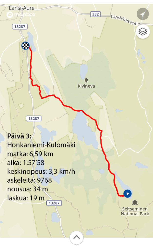 Kolmas reissupäivämme lähti suuntaamaan kohti aloituspaikkaamme, eli Kulomäkeä. Kolmannen päivän reitti koostui selkeästi enemmän soista ja pitkospuista; vaikka niitä oli jo aiempinakin päivinä ollut, niin nyt pitkoksia suovetten päällä tallusteltiin selkeästi enemmän kuin kahtena aikaisempana päivänä. Lakkaa näytti tulevan aika reippaasti, ja juottaessamme koiria lammen rannalla saatoin eksyä vähäksi aikaa syömään kypsiä lakkoja… mmm-mmm-mmm!