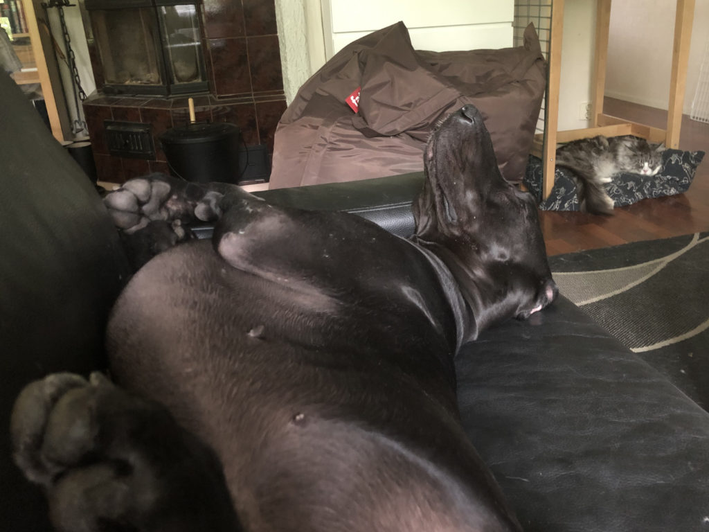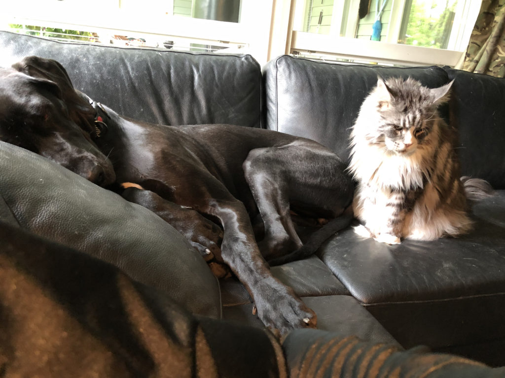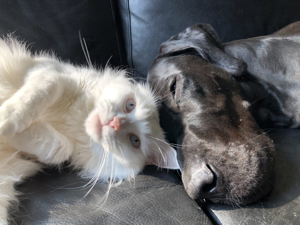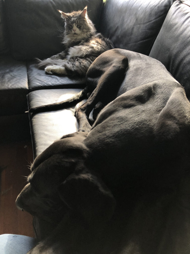 Kaverikuvia Lumin ja Igorin kanssa. Nämä ovat oikeasti aika harvaisia – onneksi enenemään päin olevia – yhteisotoksia, sillä kissat edelleen välttävät ihan Nemin vieressä olemista. Koira kun osaa olla liikkeissään varoittamattoman nopea, ja kissat eivät selkeästikään halua jäädä alle. Aina välillä, etenkin iltarauhoittumisen aikaan, näitä kyllä näkee koko ajan enemmän yhdessä sohvalla… Alkaa itse asiassa olla lähes joka iltaista, että jos ennätämme sohvalle asti istumaan, tulee Nemi välittömästi kainaloon nukkumaan ja samaa vauhtia sinne kiirii puriseva ja huriseva Lumi. Igorin mielestä parhaat halitteluhetket ovat enemmän aamuisin ja päivällä.