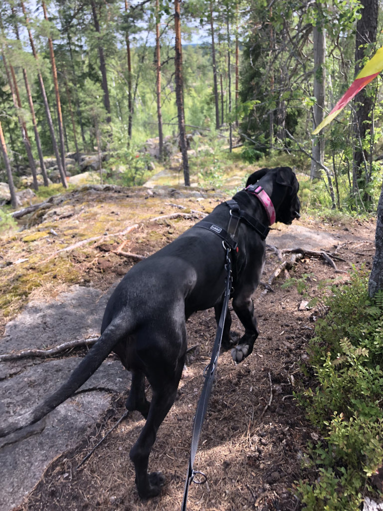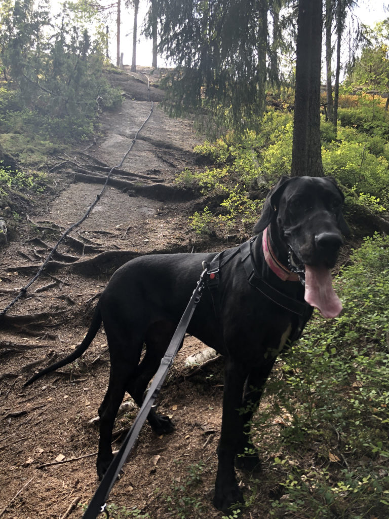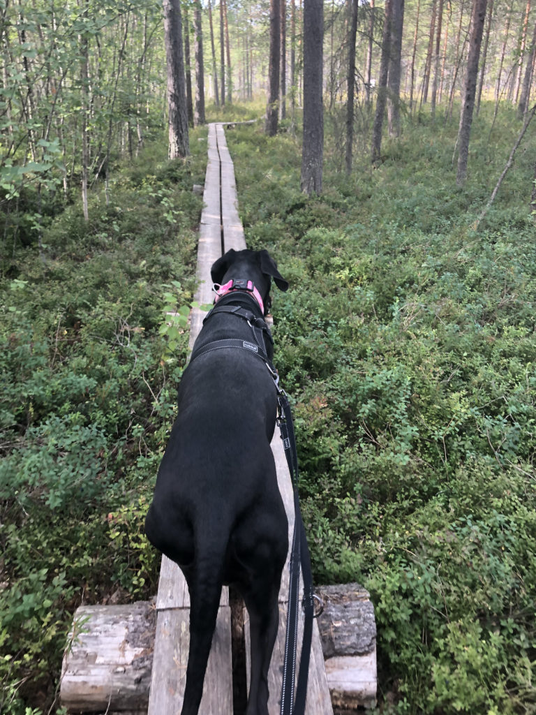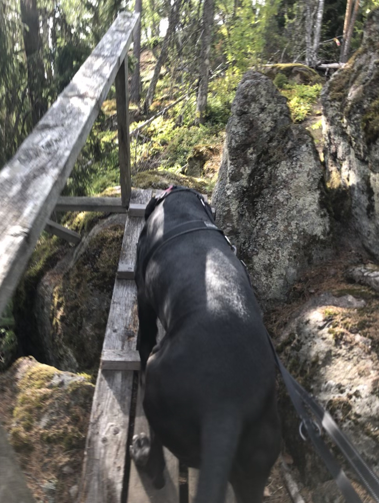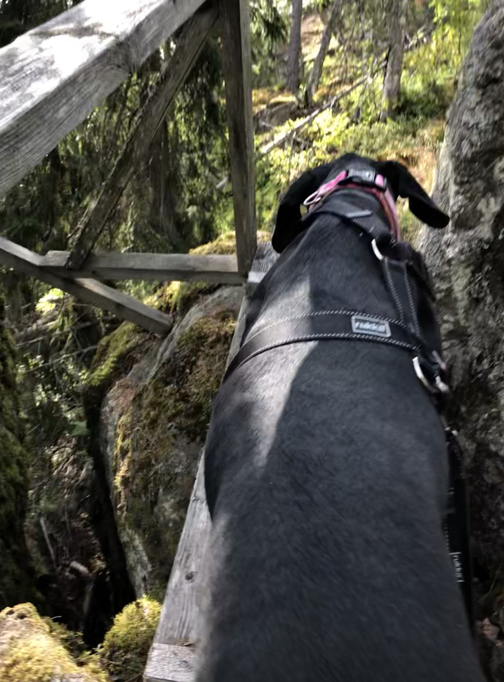 Laavun jälkeen reitti lähtee pian kipuamaan melkomoisen nousun kera Huuhkajavuorelle. Kallion huippu on noin 80 metrissä. Nousu on kuitenkin vivahteikas ja vauhdikas, ja saa sykkeetkin ihan mukavasti nousuun. Matkalla ylös ylitetään myös pari kivenjärkälettä ylittävä, nousukulmassa oleva silta. Tämä meinasi hetken olla Nemille hieman haasteellinen, sillä polkuanturat luistivat kuivan pitkospuun pinnalla, eikä Nemi saanut pitoa tassuihinsa vinolla alustalla. Ja vielä kun sillan vasemmalta puolelta aukesi ammottava pudotus alas, niin neiti asetteli hieman tutisevat tassunsa aika tarkkaan sillalla. Tästäkin kuitenkin selvittiin!