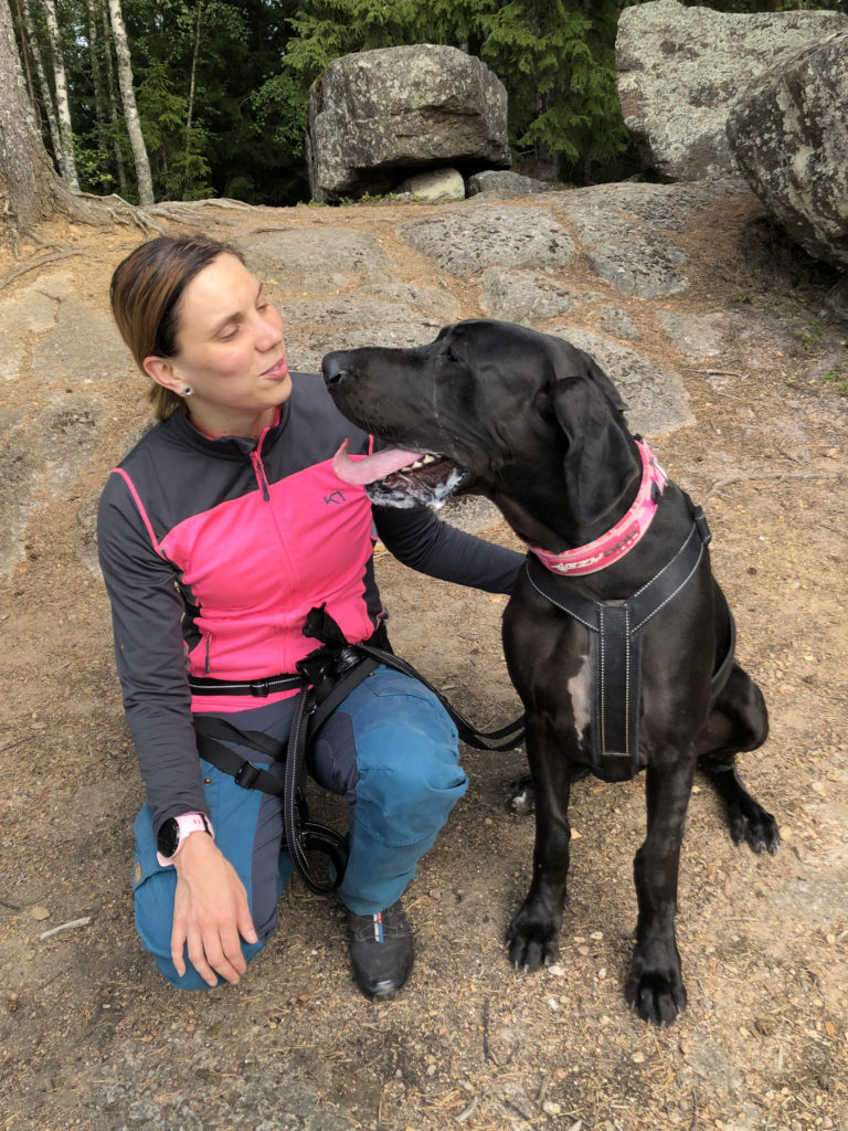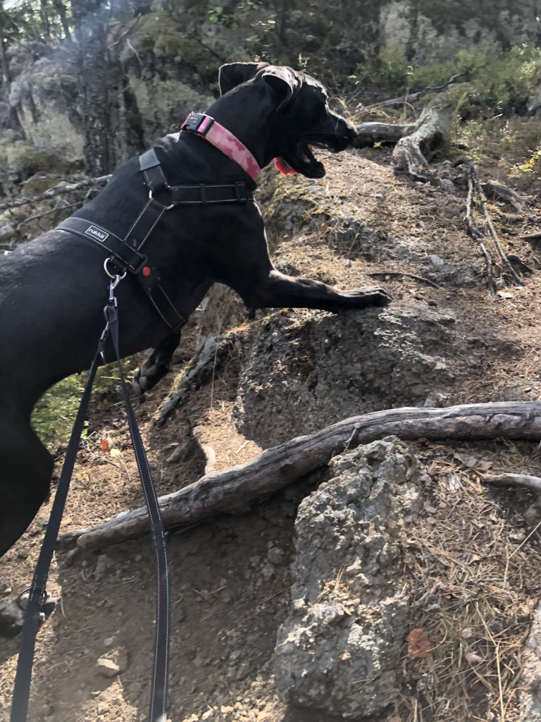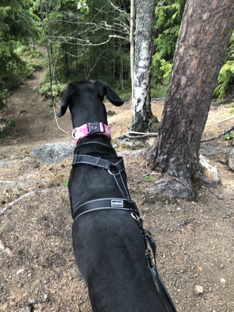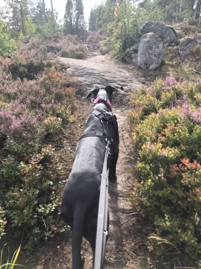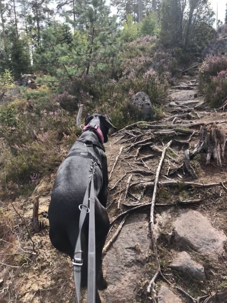 Laavun jälkeen reitti lähtee pian kipuamaan melkomoisen nousun kera Huuhkajavuorelle. Kallion huippu on noin 80 metrissä. Nousu on kuitenkin vivahteikas ja vauhdikas, ja saa sykkeetkin ihan mukavasti nousuun. Matkalla ylös ylitetään myös pari kivenjärkälettä ylittävä, nousukulmassa oleva silta. Tämä meinasi hetken olla Nemille hieman haasteellinen, sillä polkuanturat luistivat kuivan pitkospuun pinnalla, eikä Nemi saanut pitoa tassuihinsa vinolla alustalla. Ja vielä kun sillan vasemmalta puolelta aukesi ammottava pudotus alas, niin neiti asetteli hieman tutisevat tassunsa aika tarkkaan sillalla. Tästäkin kuitenkin selvittiin!