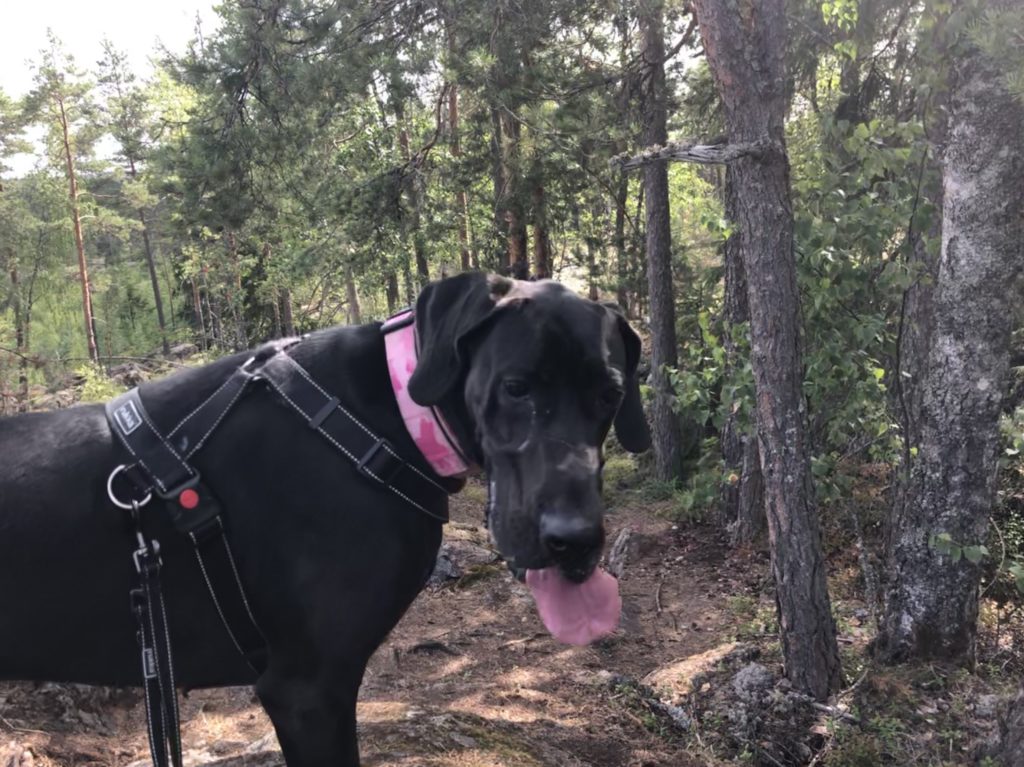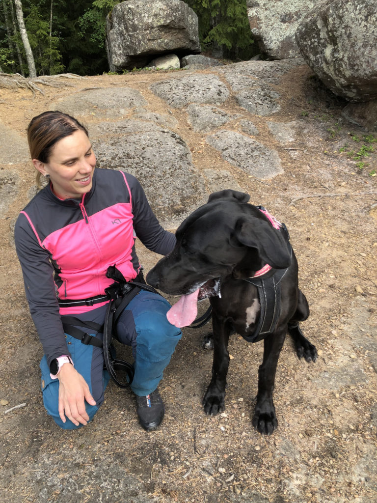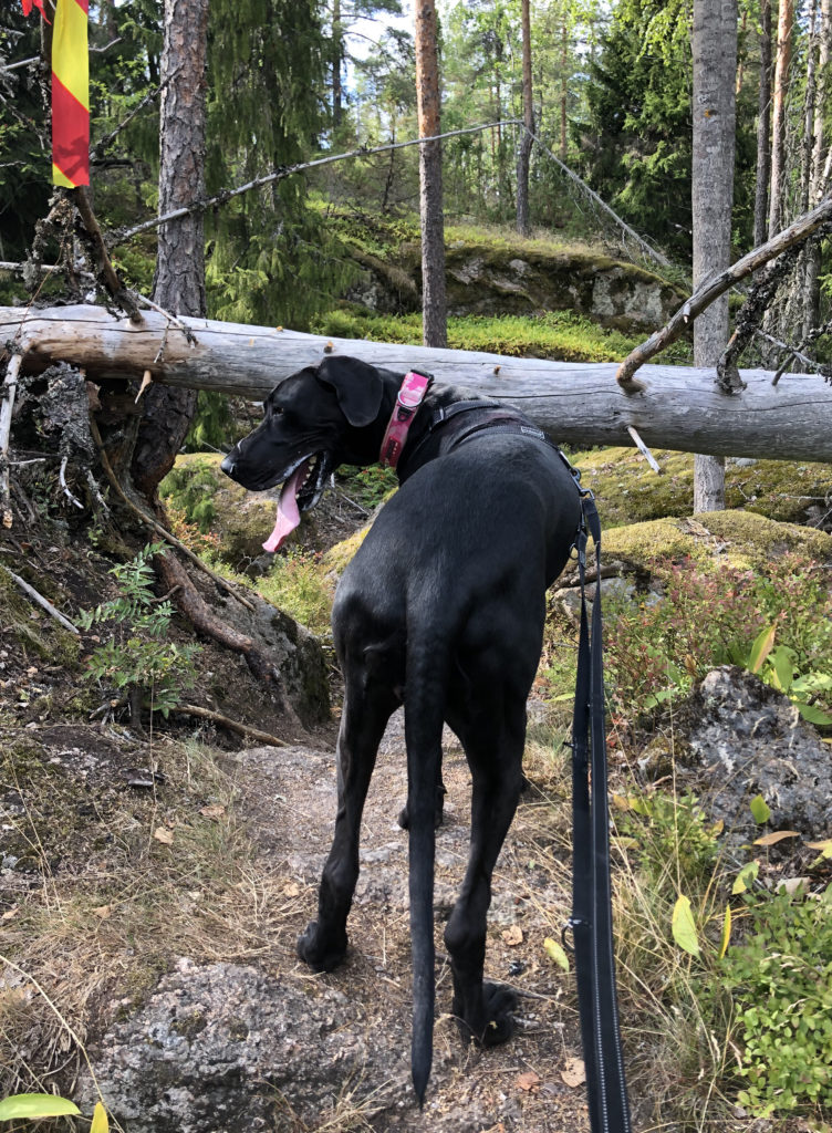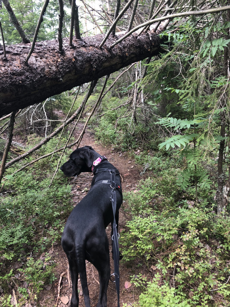 Puolessa välissä matkaa sijaitsee oikein miellyttävä taukopaikka, Kukuljärven laavu. Paikalla oli myös pari muutakin retkeilijää, mukaan lukien Nemin ikäinen borderterrieripoika, joka tuli luvan kanssa tervehtimään Nemiä. Nemin reaktiot olivat taas mainioita, kun innokas pikku terrieri kiipesi kahdella jalalla seisten suoraan naamalle: Nemin niskavillat nousivat hetkellisesti nopeasti iholle tulleen tyypin vuoksi, mutta asettui samantien ja sitten hännät alkoivat viuhuta. Nuuhkuttelujen jälkeen meinasi lähteä leikkivaihe päälle – molemmat kakarat piti ottaa ihan haltuun ettei ruvettaisi riehumaan 😀 Tällä kertaa emme jääneet pitemmälle tauolle, vaan veden hörppäämisen ja välipalojen syönnin jälkeen jatkoimme heti matkaa.
