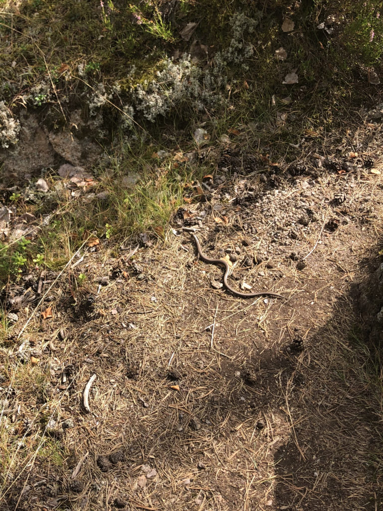Kalliolla kohdattiin myös kuparinen, vauhdikas vaskitsa! Onneksi Nemin nenän edestä liikkeelle lähtenyt luikertelija oli vaskitsa eikä kyy; voin kertoa, että tuon kohtaamisen jälkeen olin taas todella valppaana loppu lenkin ja kuvittelin näkeväni käärmeitä jokaisen juurakon kohdalla.