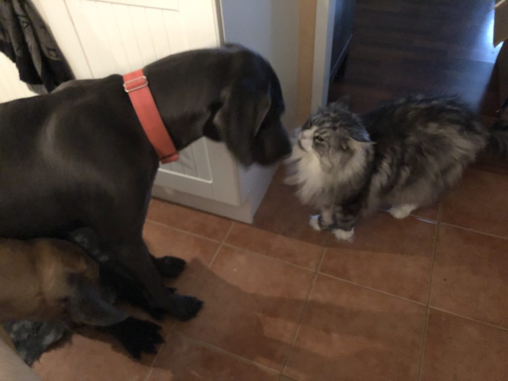 16 kk vanhalla Hekla “ikiliikkuja” Heklanaattorilla oli pieniä itsehillintävaikeuksia sisätiloissa, kun olisi pitänyt saada häirätä, ja leikkiä, ja riehua, ja jahdata kis tutustua kissoihin ja ja… sen sijaan, kun olisi pitänyt rauhoittua iltatoimiin 🙂 Mutta onneksi meidän kissatkin ovat aika supertyyppejä, niin tutustuminen niihinkin onnistui loppujen lopuksi aika nopeasti.