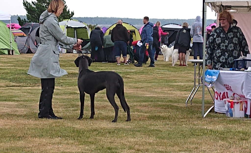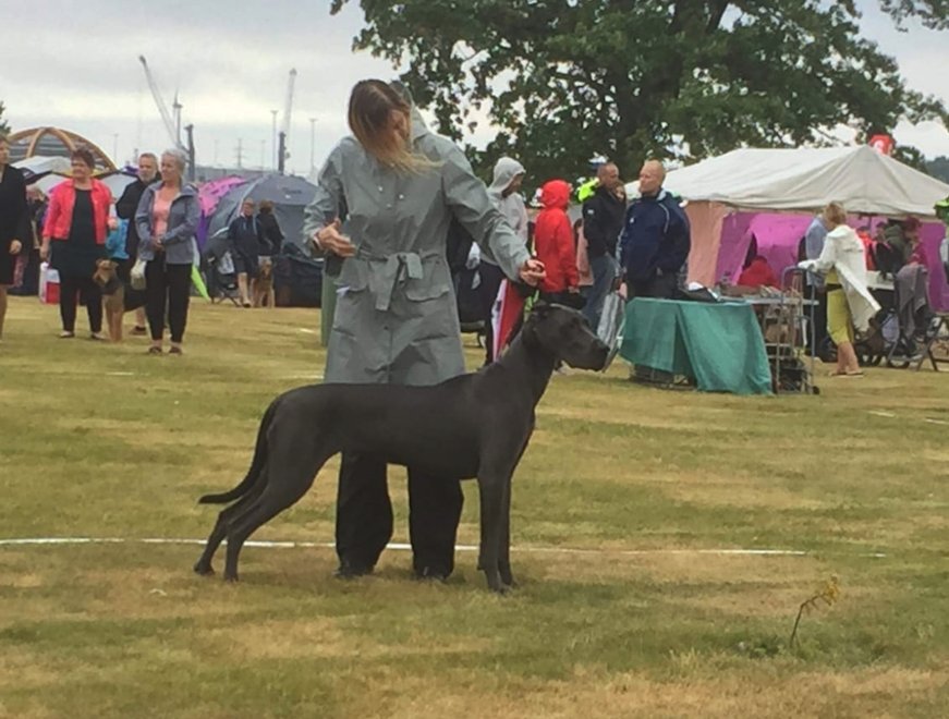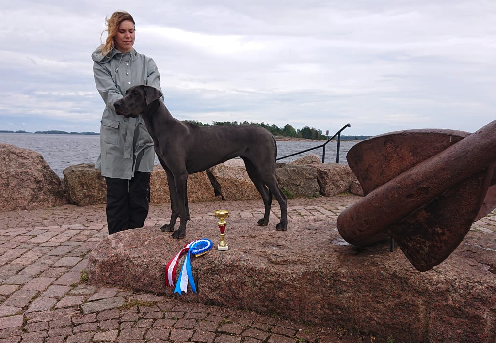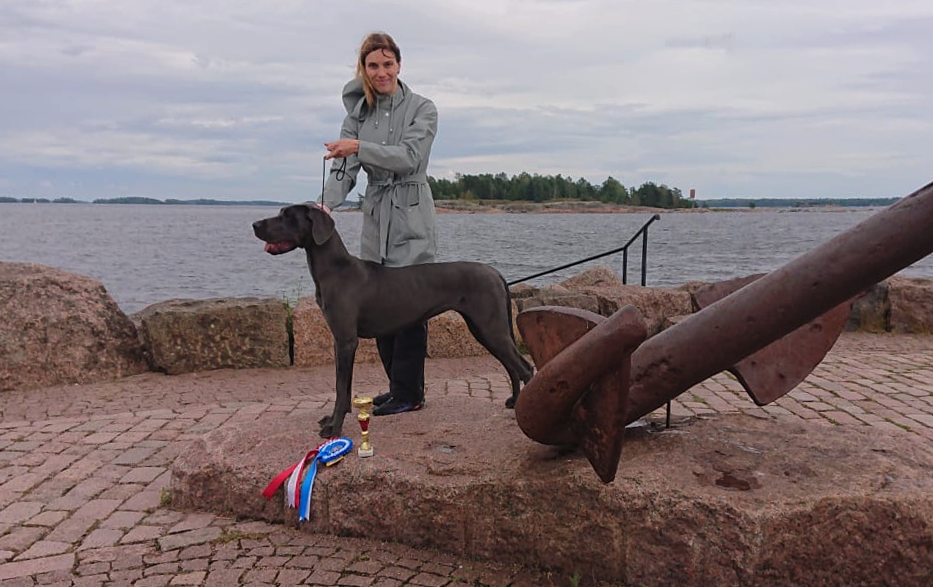 Ja niinpä sitten sunnuntaiaamuna suunnattiin tuulen ja saadekuurojen siivittämänä Kotkan Katariinanpuistoon. Hekla käyttäytyi ja esiintyi erittäin hienosti ja rauhallisesti, ja juokseminen kehässä oli hyvin vaivatonta ja koiran askel helppoa. Kun hetkeä aiemmin Niina teki luotamme katoamistempun, jäi Hekla seisomaan näyttelykehään aivan skarppina tuijotellen paikkaan, jossa oli viimeksi Niinan nähnyt – se siis esiintyi ja seisoi aivan todella upeasti. Tulos oli ansaittu ERI 1, SA ja lopulta valionarttujen kanssa kilpaillessa tuli hienosti sijalle PN3. Näin ollen Hekla sai ensimmäisen SERTinsä ja oli samalla näyttelyssä järjestetyn Royal Canin Junior -kisan ROP-Juniori. Tämä olisi mahdollistanut meille pääsyn iltapäivällä Royal Canin Junior -loppukilpailuun, mutta päätimme jättäytyä tästä kisailusta pois.