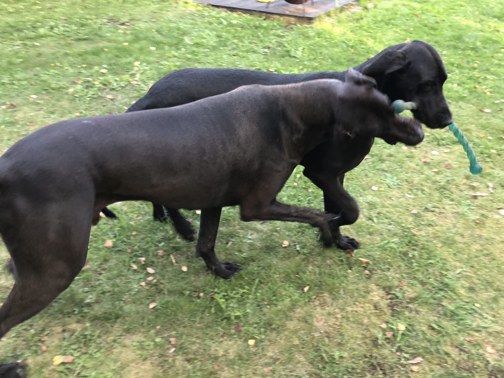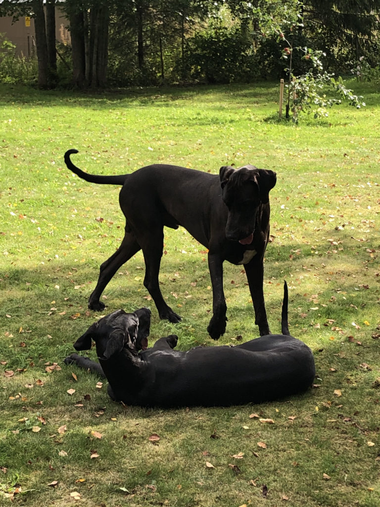 Sisaruksilla oli hienosti koko lauantaipäivä aikaa touhuta pihalla, samalla kun me purimme polttopuusavottaa. Aamupäivällä yhteisleikit sisälsivät huomattavasti enemmän juoksemista, spurttailua ja rallattelua; mitä pitemmälle päivä eteni, sitä vähemmän nähtiin juoksemista ja samassa suhteessa enemmän hammasmiekkailua kylkiasennossa maaten. Päivän touhuamisten jälkeen koirista ei juuri muuta nähnyt ja kuullut kuin pediltä kuuluvan kuorsauksen!
